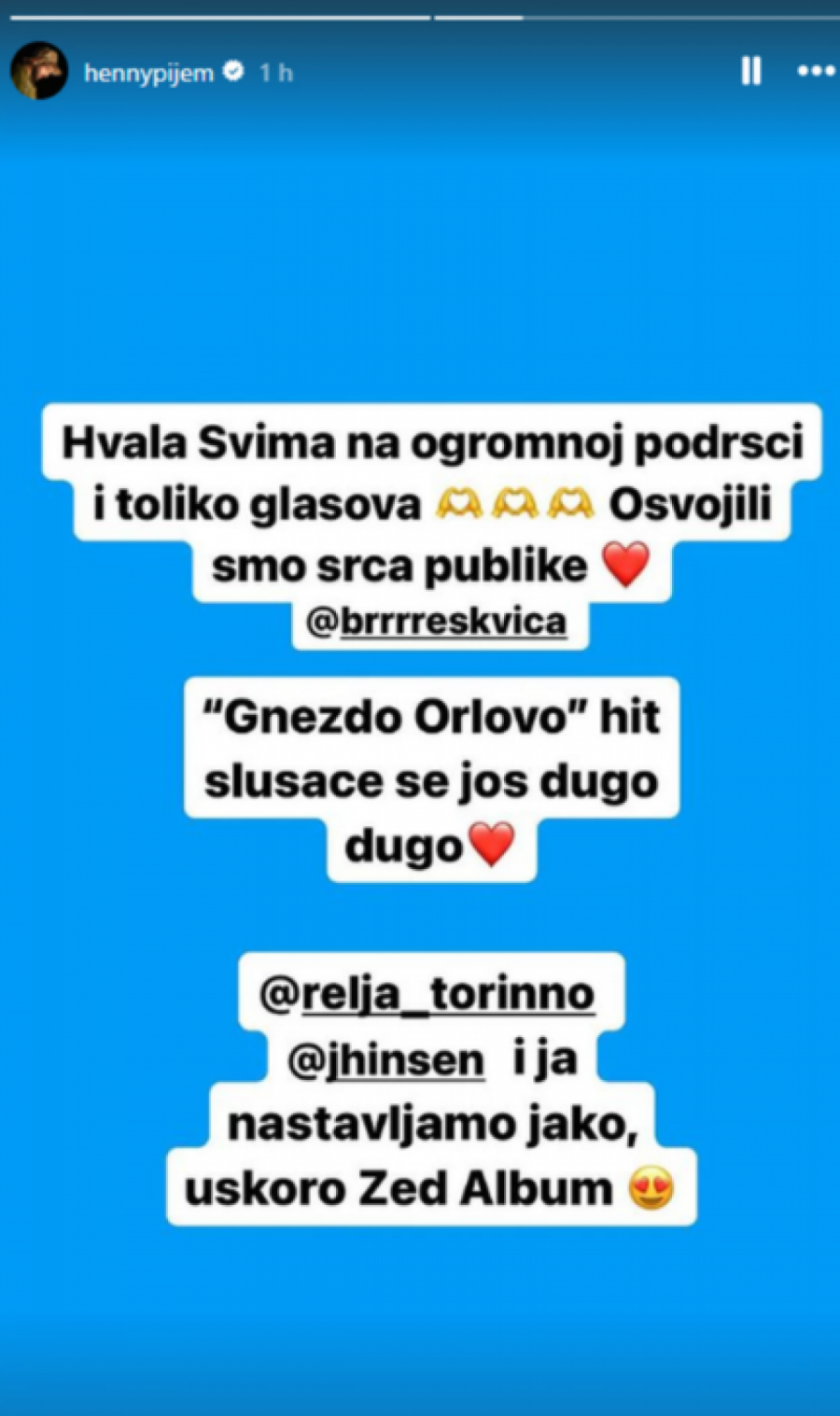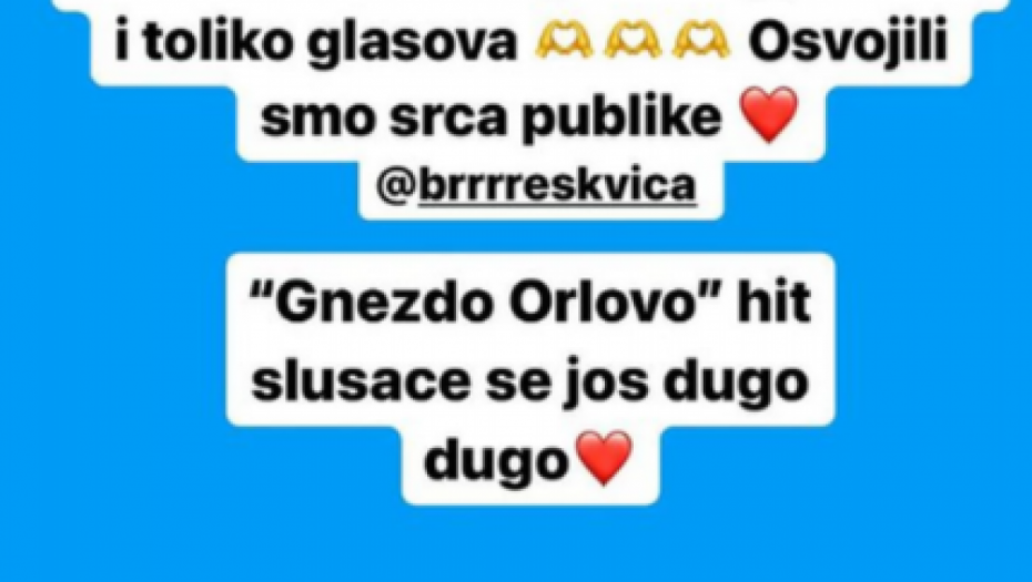 - Hvala svima na ogromnoj podršci i toliko glasova. Osvojili smo srca publike. Gnezdo orlovo, hit, slušaće se još dugo, dugo. Nastavljamo jako - napisao je Heni na Instagramu.
