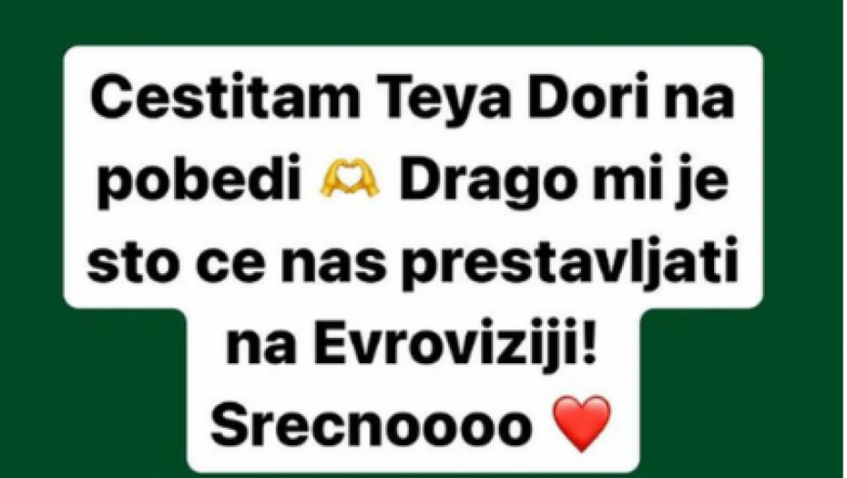 - Čestitam, Teya Dori na pobedi. Drago mi je što ćeš nas predstavljati na Evroviziji. Srećno.