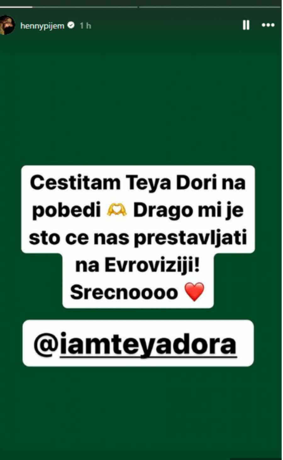 Kompozitor Breskvicine pesme "Gnezdo orlovo" Heni, sada se oglasio i sportski čestitao Teya Dori pobedu.