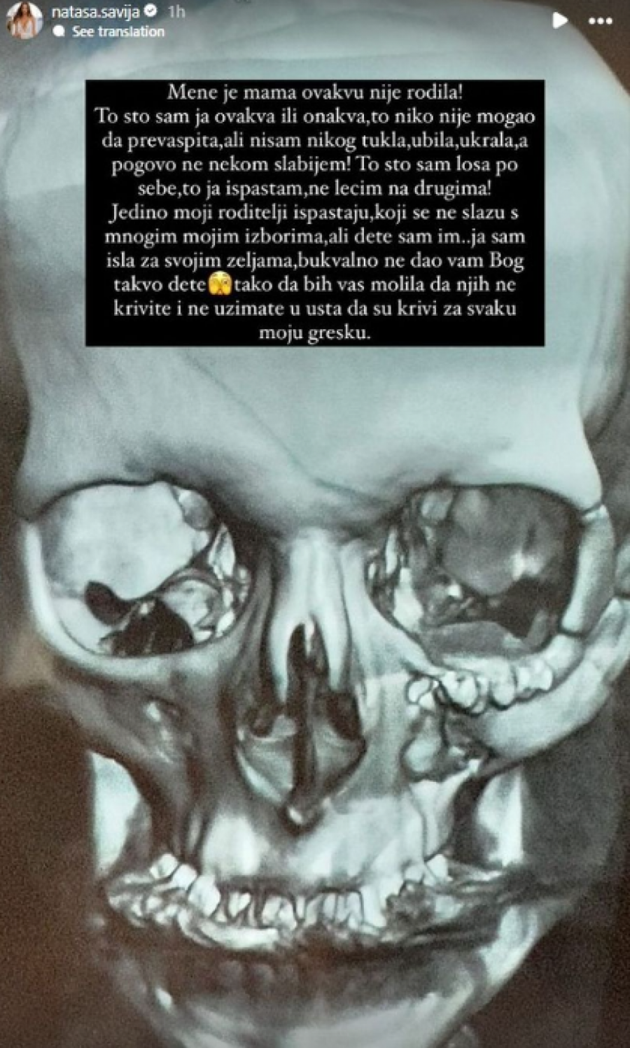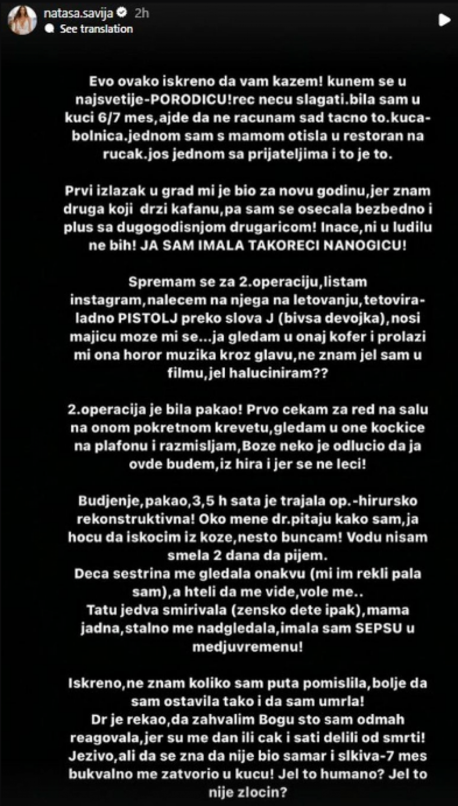 - Iskreno, ne znam koliko puta sam pomislila da bi bilo bolje da sam umrla. Doktor je rekao da zahvalim Bogu što sam odmah odreagovala jer su me dani ili čak sati delili od smrti. Jezivo, ali da se zna da nije bio šamar, bukvalno me je zatvorio u kuću na 7 meseci. Da li je to humano? Da li to nije zločin? - zaključila je Nataša na svom Instagram profilu.