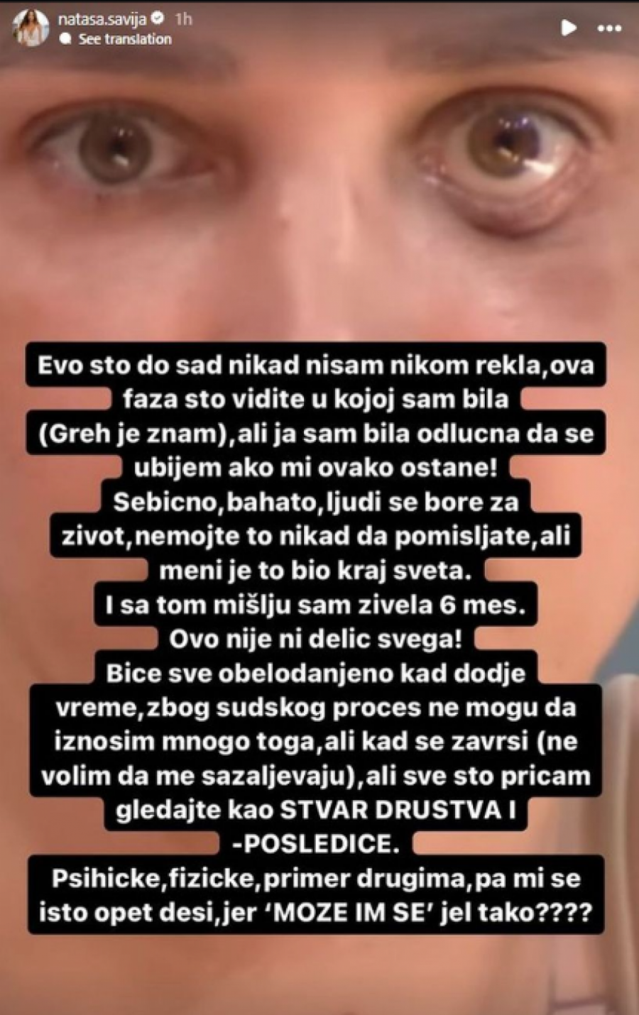 - Evo što do sada nikome nisam rekla, u ovoj fazi sam bila odlučna da se ubijem, ako mi ovo ovako ostane. Sebično, bahato, ljudi se bore za život, nemojte to nikada da pomišljate, ali meni je to bio kraj sveta - priznala je Nataša.