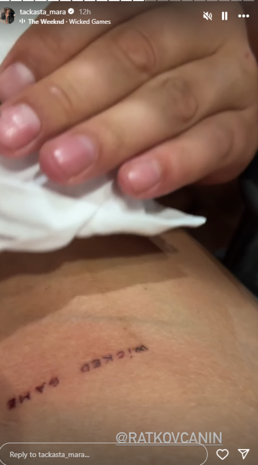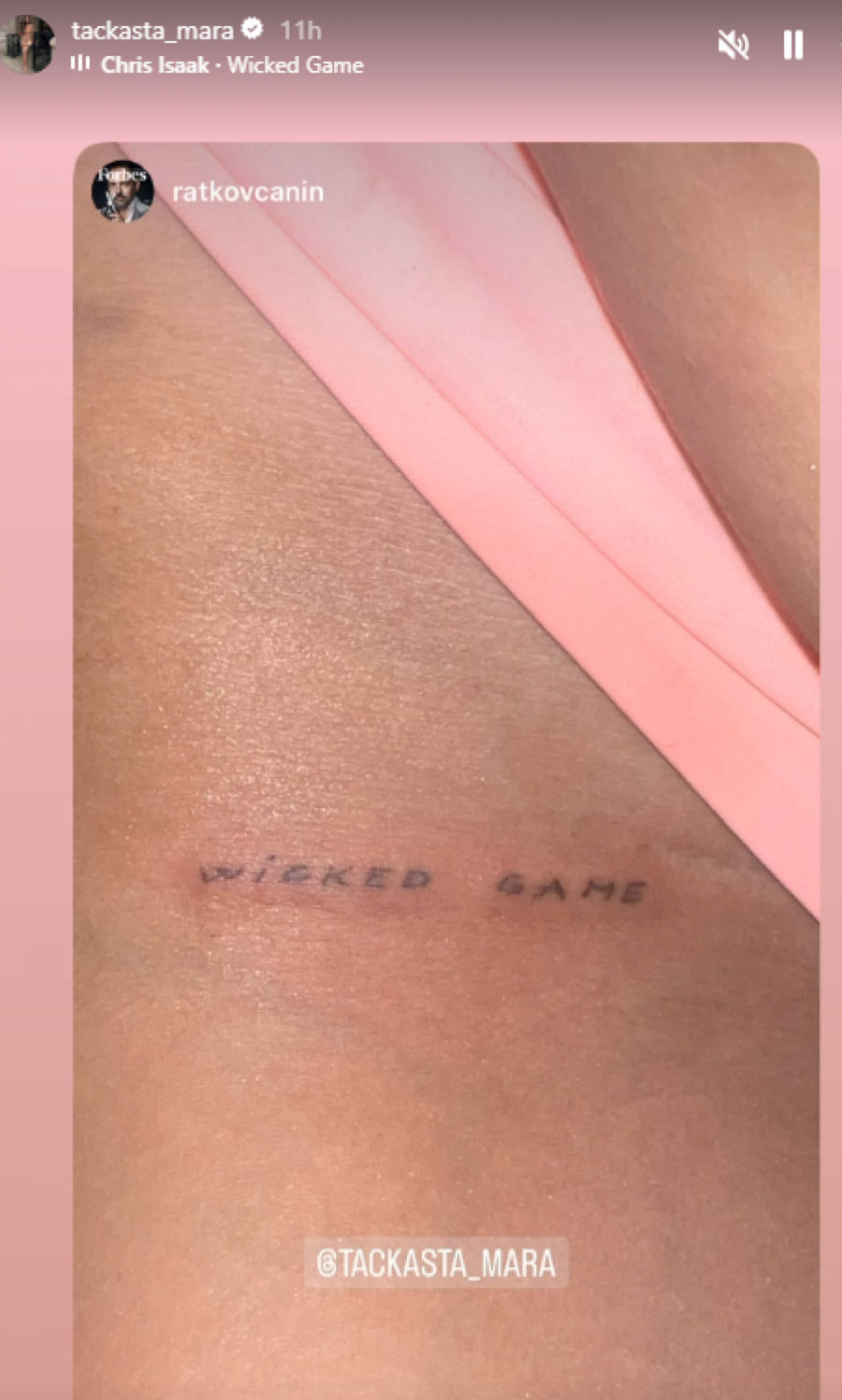 Prva tetovaža se nalazi na preponama i radi se o nazivu pesme Krisa Ajzaka "Wicked Game", a druga je na leđima i piše "LOVE", odnosno "Ljubav".