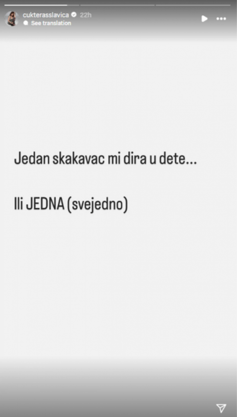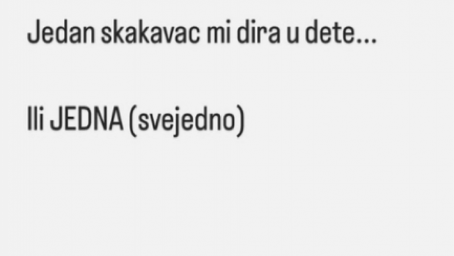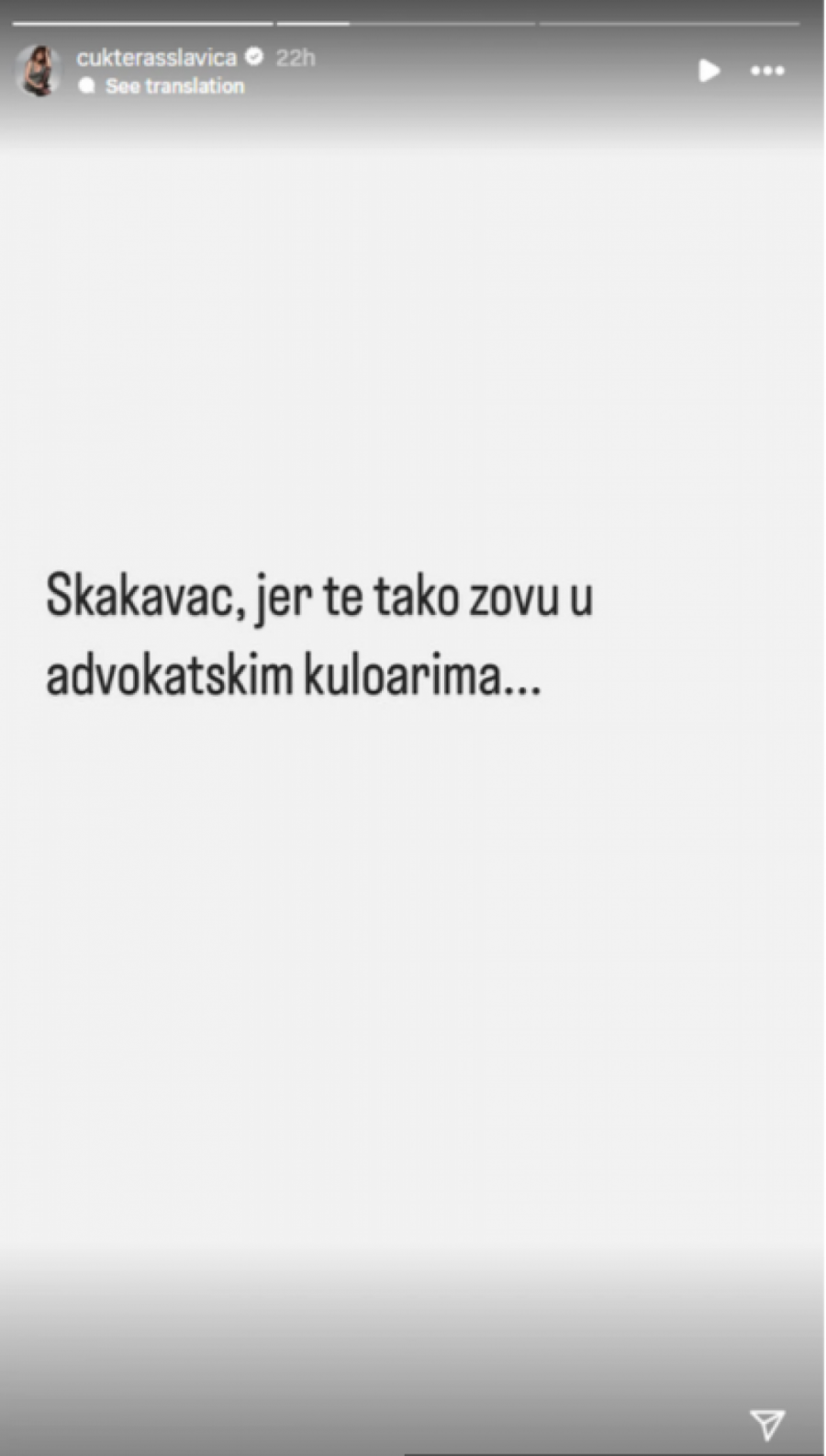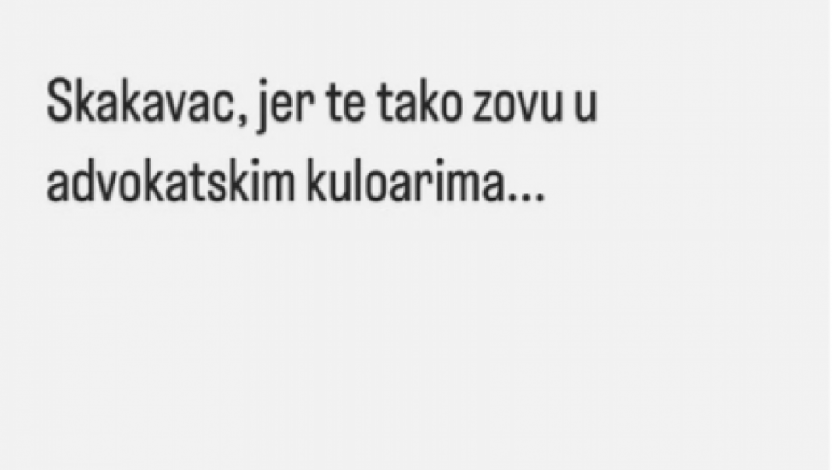 - Jedan skakavac mi dira u dete... Ili jedna, svejedno! Skakavac, jer te tako zovu u advokatskim kuloarima - navela je Slavica u objavama na Instagramu.
