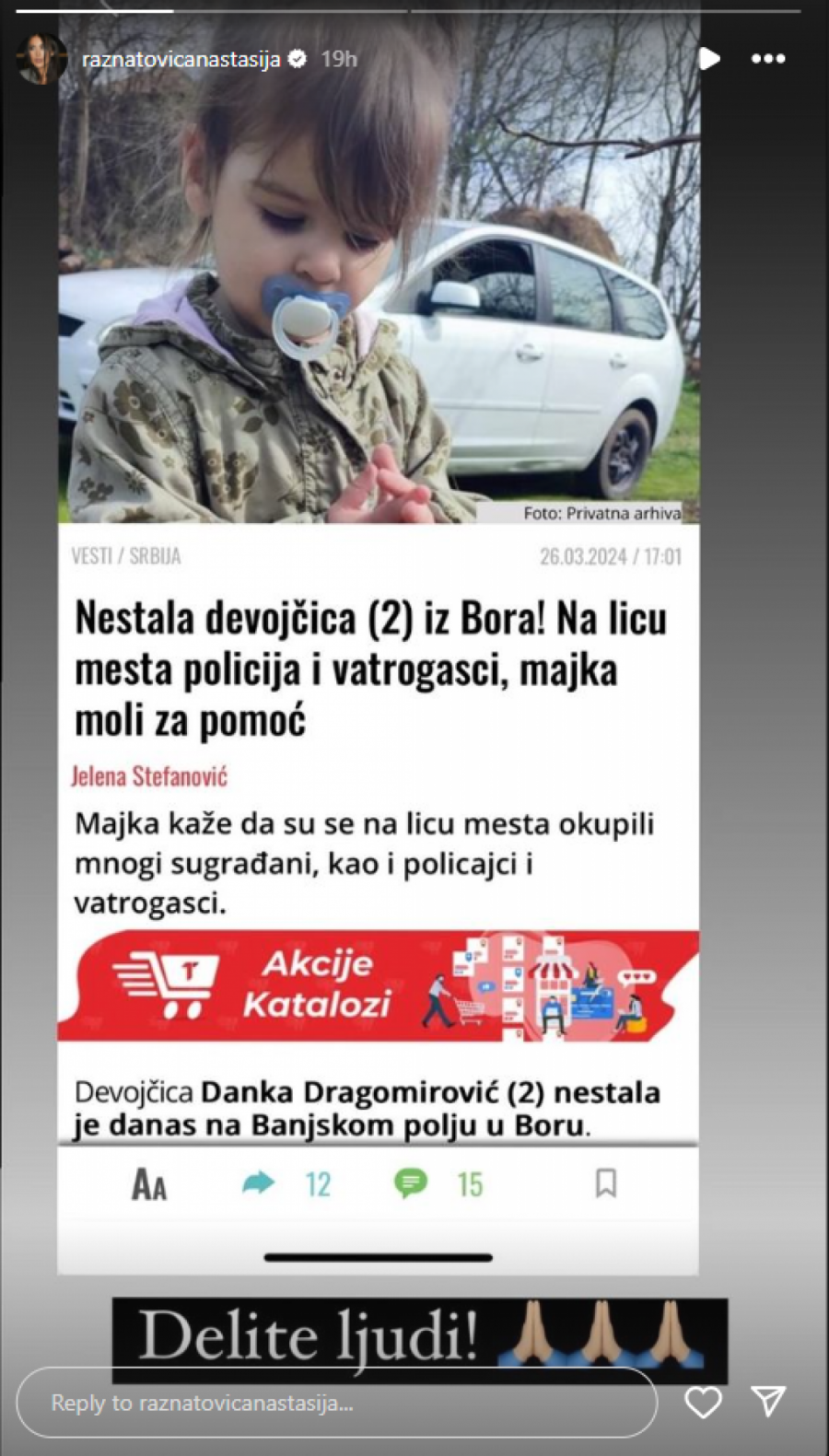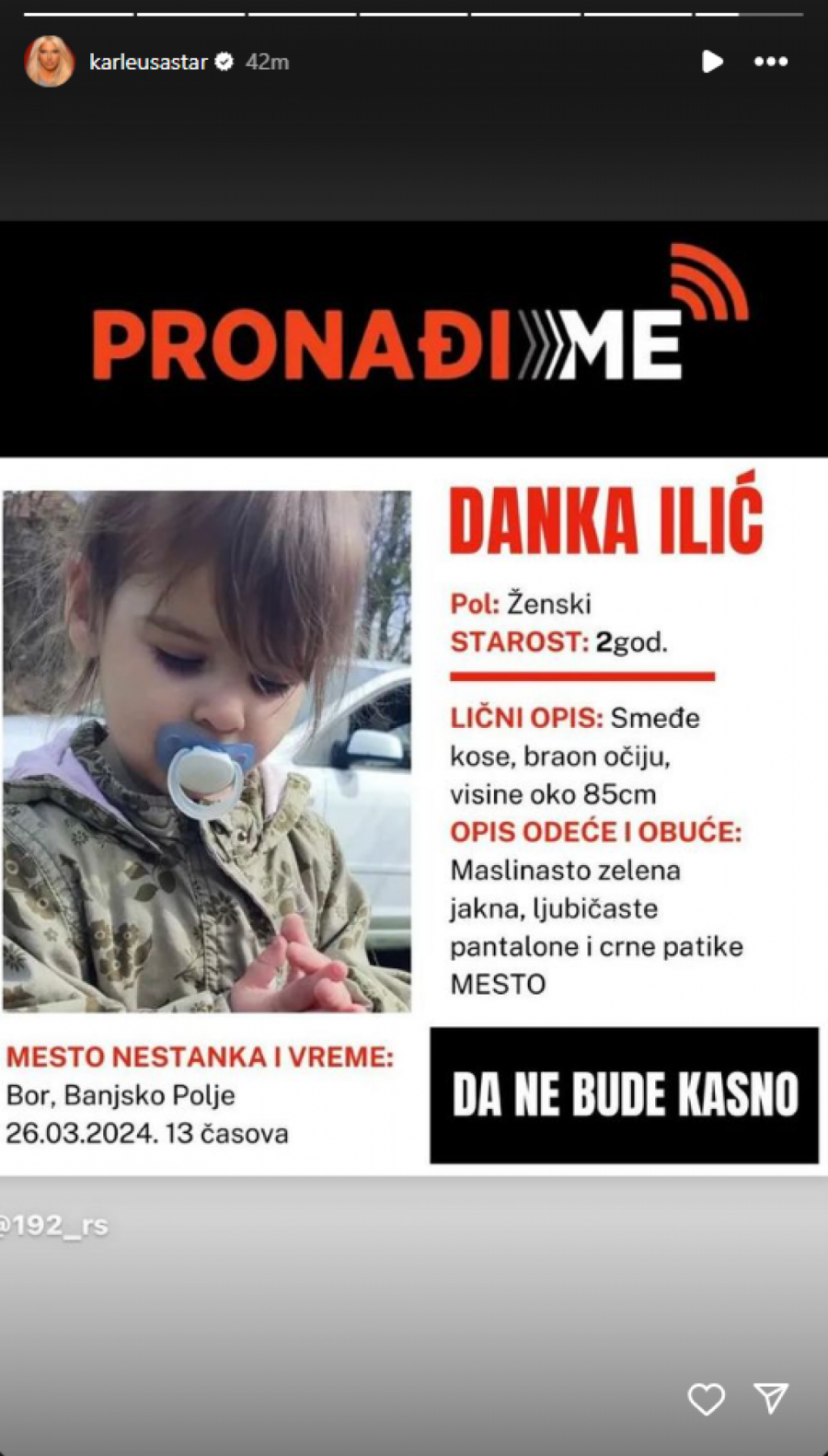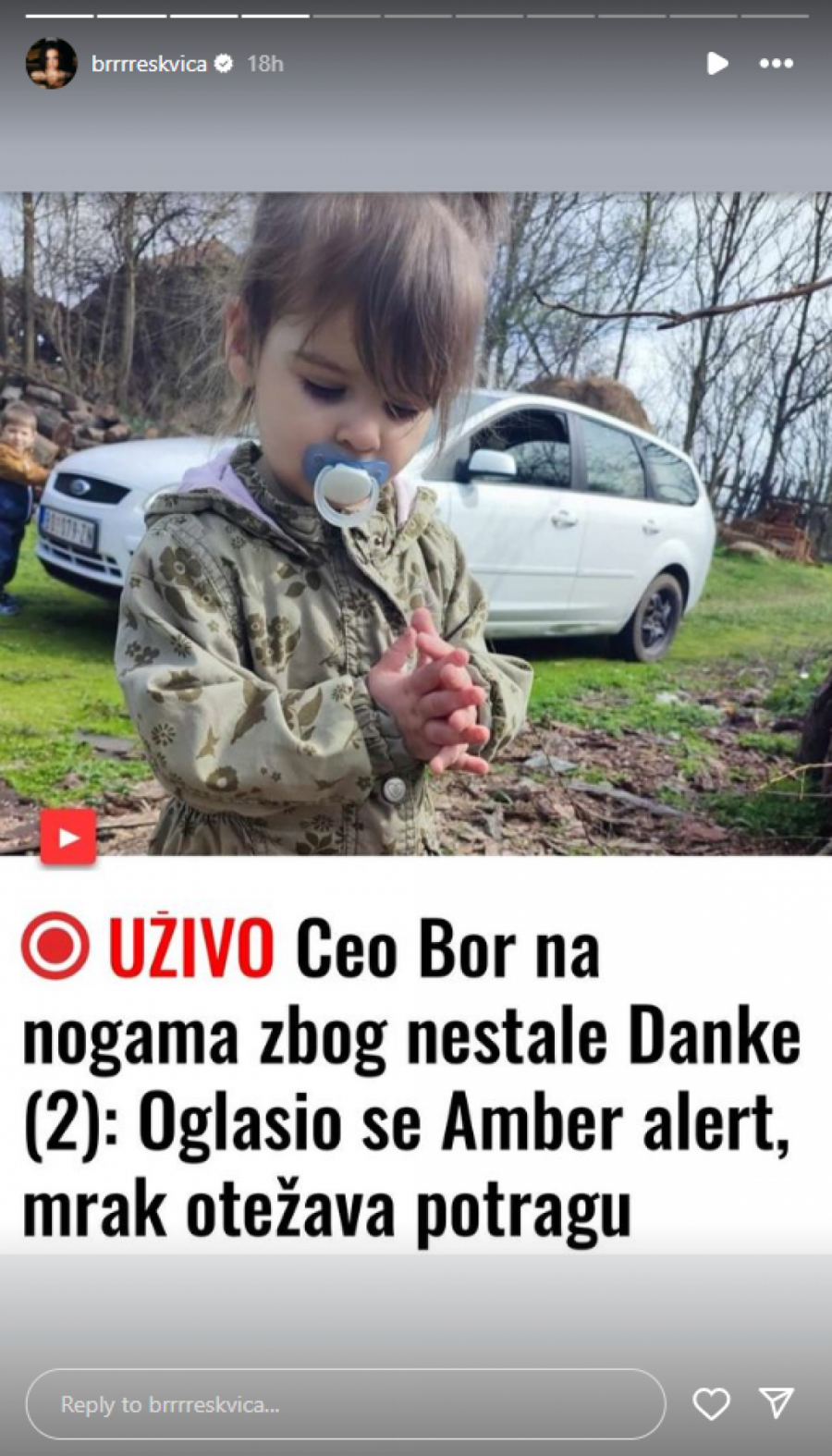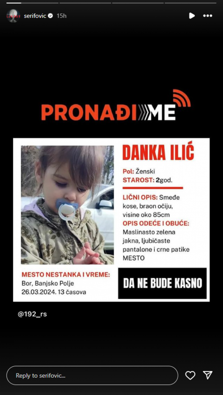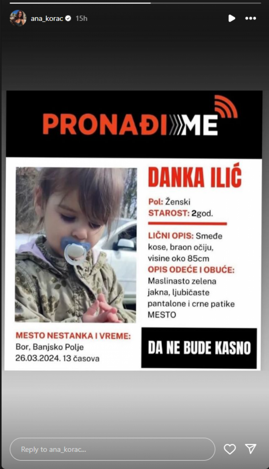 Osim građana, akciji su se pridružile i brojne poznate ličnosti, koje su na svojim profilima na Instagramu podelile zvaničnu objavu sa slikom nestale Danke.