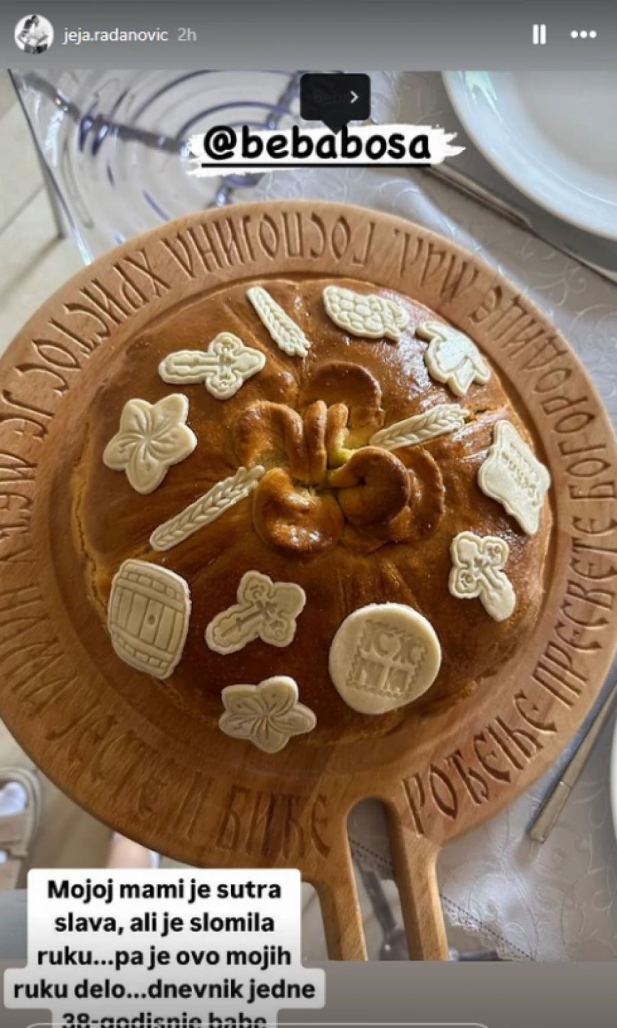- Mojoj mami je sutra slava, ali je slomila ruku, pa je ovo mojih ruku delo. Dnevnik jedne tridesetosmogodišnje babe - napisala je Jelena šaljivo, pa se pohvalila pogačom koju je umesila.