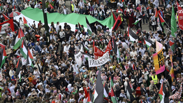 Većina ljudi viče, nosi u rukama zastave Palestine, a policija je u pripravnosti.