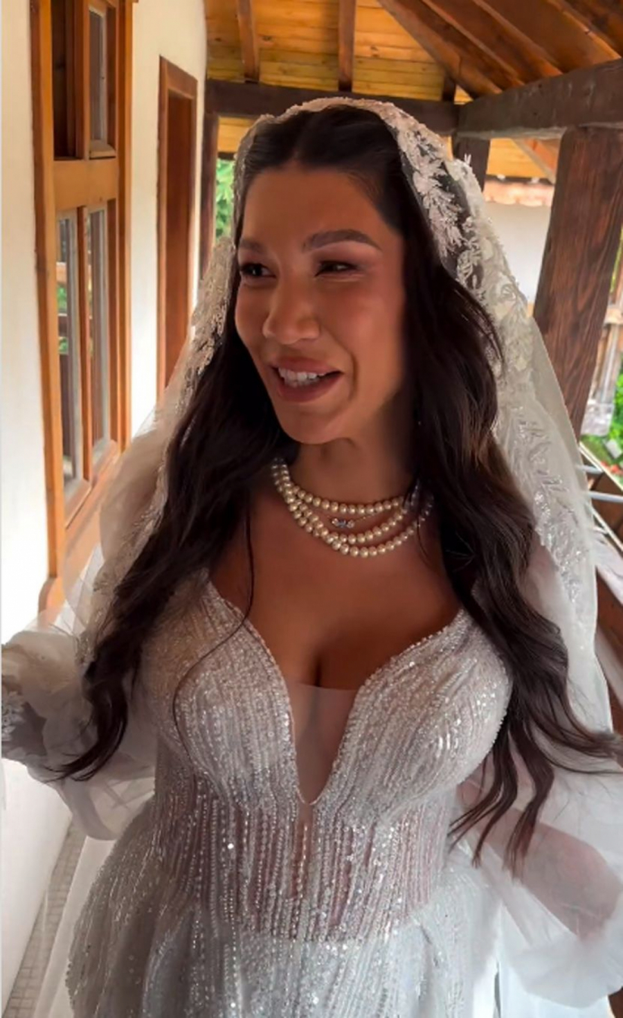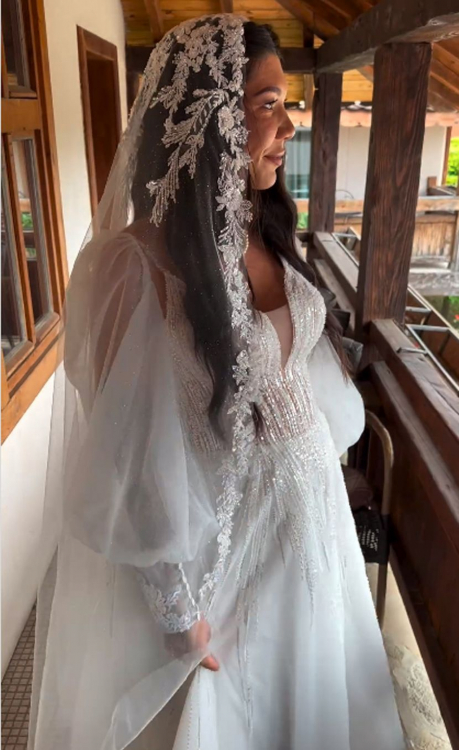 Dina je blistala u raskošnoj venčanici, a njen duboki dekolte svima je privukao pažnju. Ona je u petom mesecu trudnoće i nosi blizance, a pozirala je sa trudničkim stomakom.