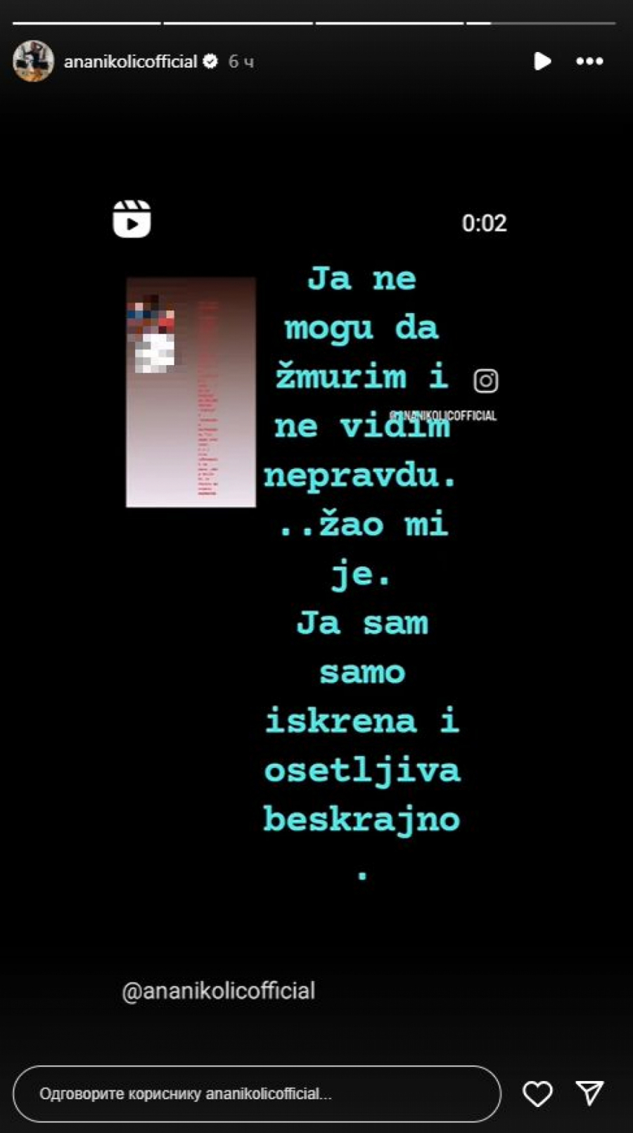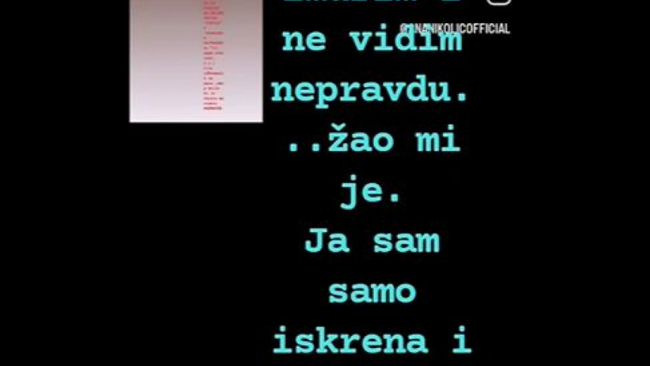 - Ja ne mogu da žmurim i ne vidim nepravdu. Žao mi je. Ja sam samo iskrena i osetljiva beskrajno - napisala je Nikolićeva.