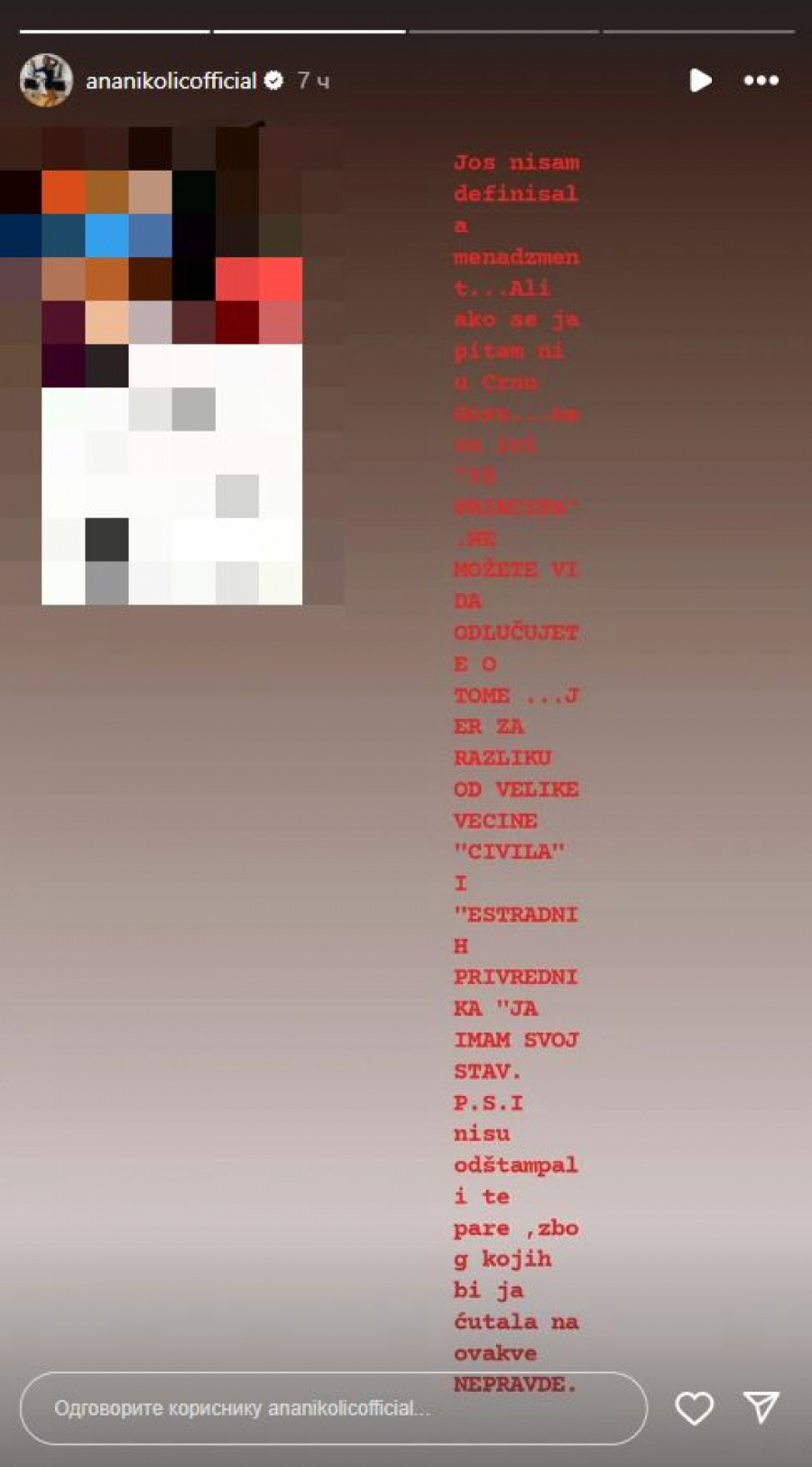 - Još nisam definisala menadžment, ali ako se ja pitam, ni u Crnu Goru neću ići "iz principa", ne možete vi da odlučujete o tome, jer za razliku od velike većine "civila" i "estradnih privrednika", ja imam svoj stav. P.s I nisu odštampali te pare zbog kojih bih ja ćutala na ovakve neprevde - napisala je Ana i dodala: