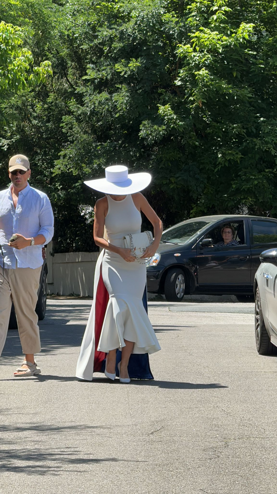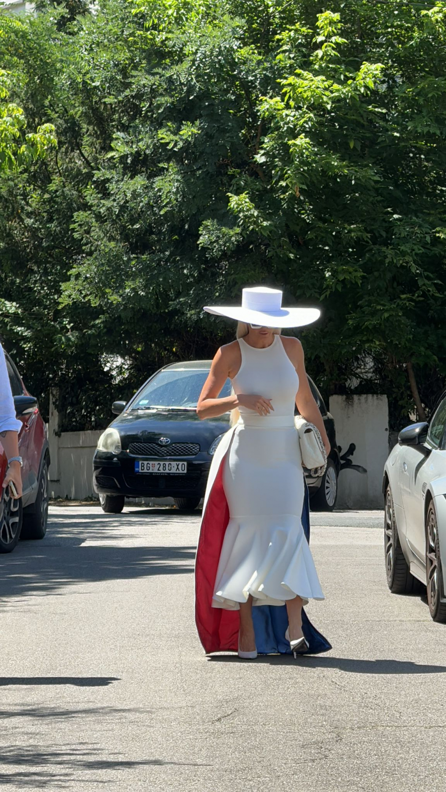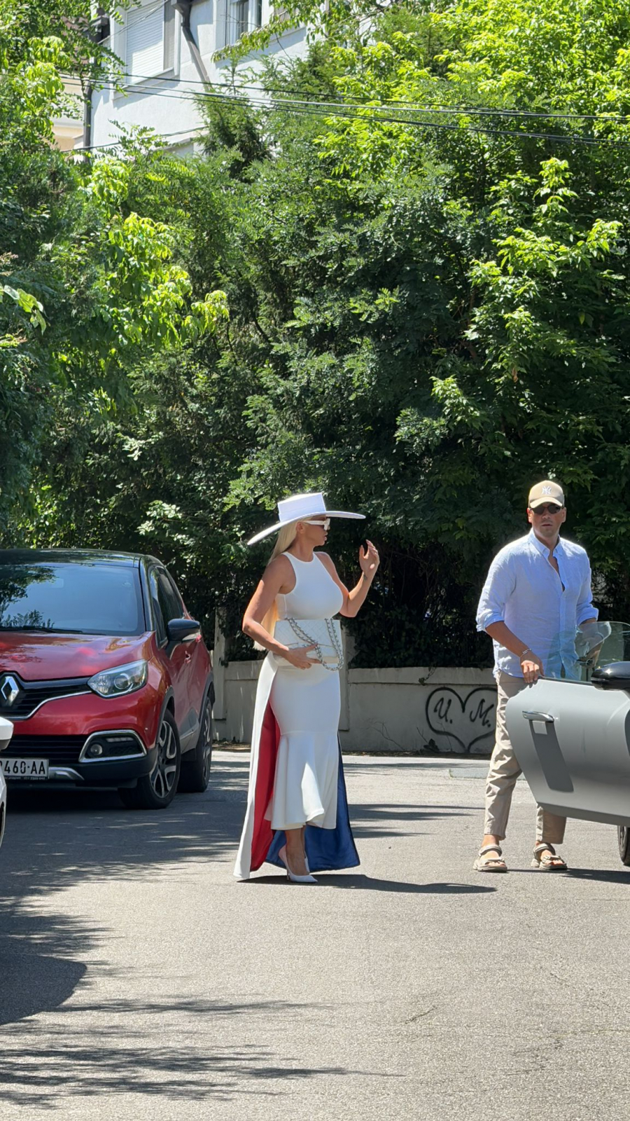 Diva se pojavila na Dedinju u beloj haljini sa kombinacijom plave i crvene, koje čine i srpsku zastavu, dok je na glavi je imala veliki šešir i bele naočare.