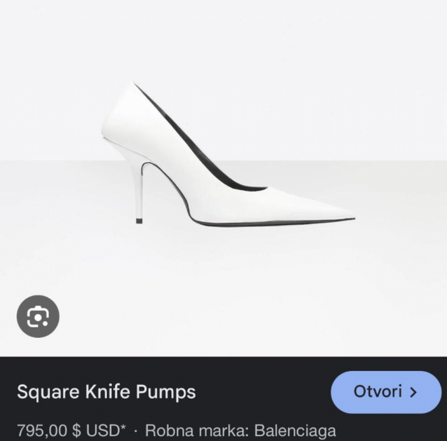 Bele salonke sa visokim potpeticama su marke "balensijaga", a koštaju oko 800 dolara.