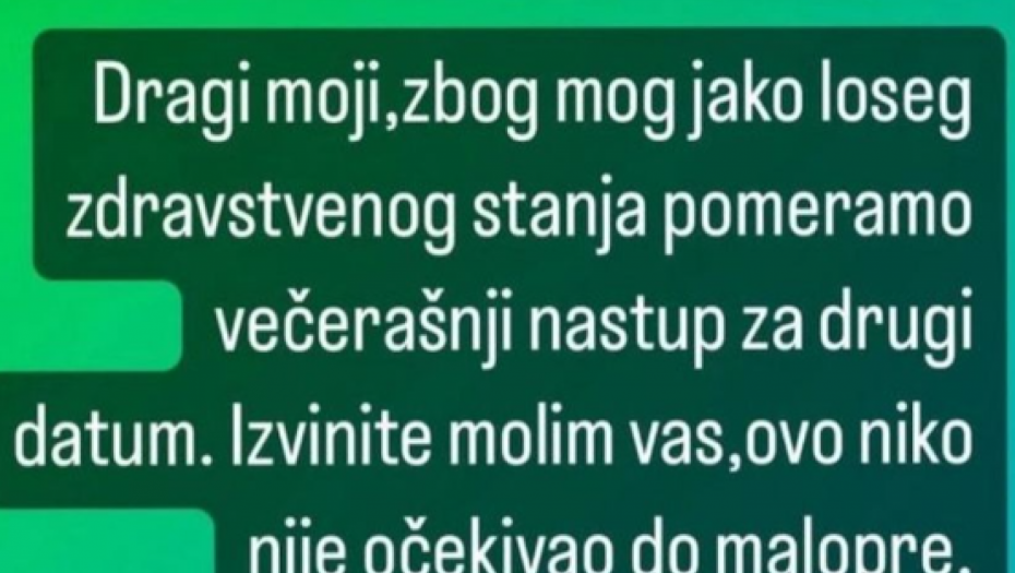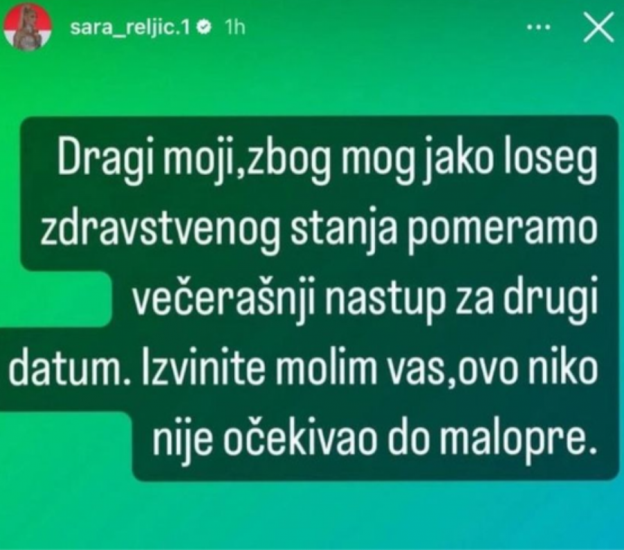 - Dragi moji, zbog moj jako lošeg zdravstvenog stanja, pomera se nastup za drugi datum. Izvinite molim vas, ovo niko nije očekivao do malopre - napisala je Sara na Instagram storiju.