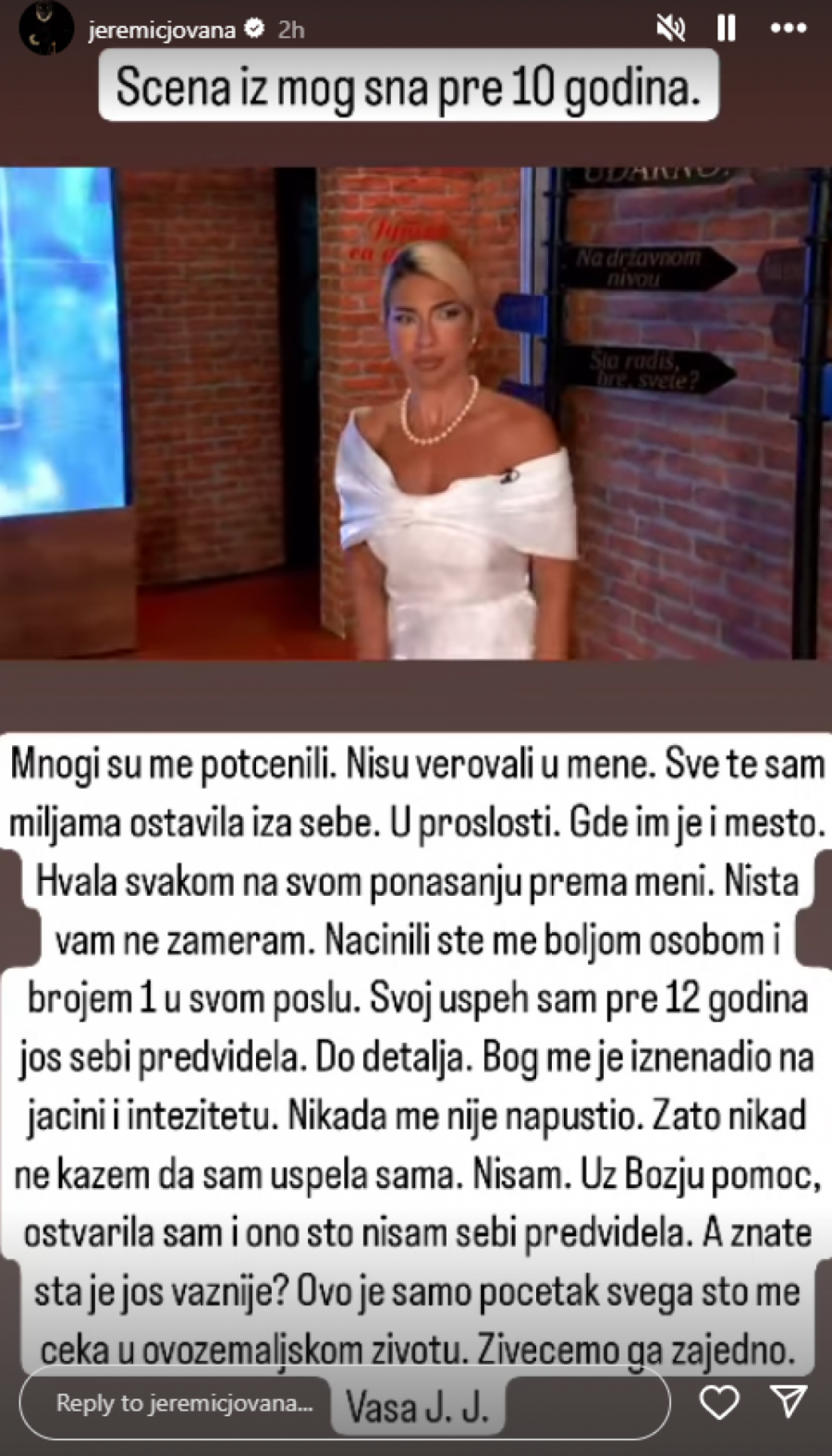 - Mnogi su me potcenili, Nisu verovali u mene. Sve te sam miljama ostavila iza sebe. U prošlosti. Gde im je i mesto. Hvala svakome na svom ponašanju prema meni. Ništa vam ne zameram. Načinili ste me boljom osobom i brojem 1 u svom poslu. Svom uspeh sam pre 12 godina još sebi predvidela. Do detalja. Bog me je iznenadio na jačini i intenzitetu. Nikada me nije napustio. Zato nikad ne kažem da sam uspela sama. Nisam. Uz Božiju pomoć ostvarila sam sve ono što nisam sebi predvidela. A znate šta je još važnije? Ovo je samo početak svega što me čeka u ovozemaljskom životu. Živećemo ga zajedno - napisala je Jovana.