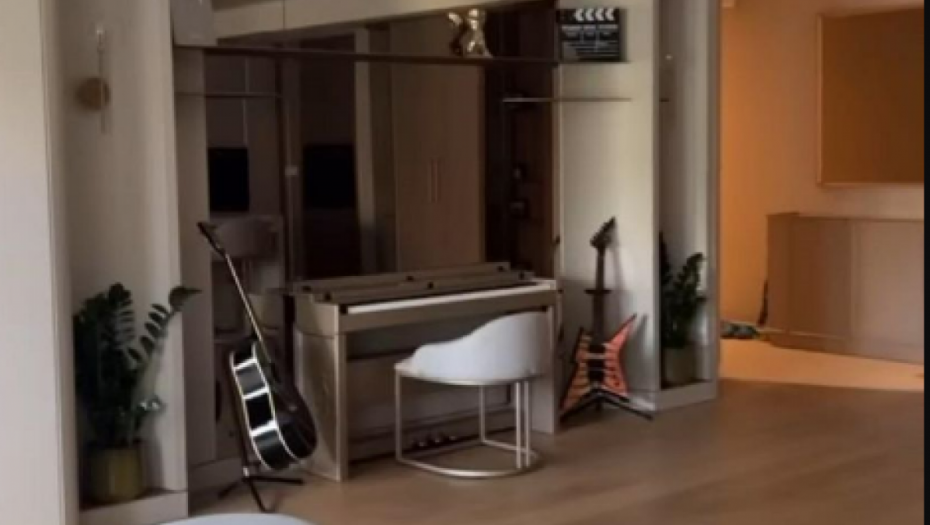 Prostorija je veoma prostrana, a u sredini sobe nalazi se klavijatura i dve gitare, što sugeriše da mlada pevačica tu provodi najviše vremena.