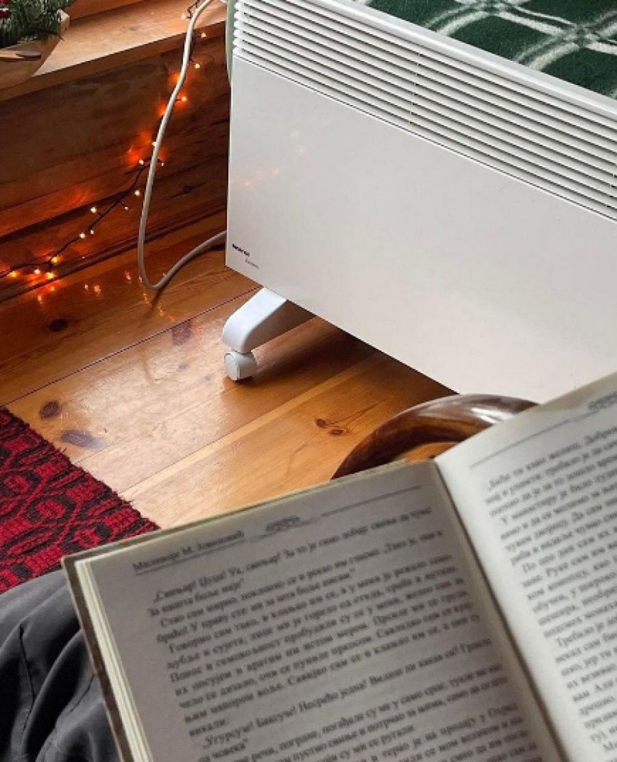 Prizor dok odmara u stolici dok čita knjigu, dok se u pozadini nalazi planinski pejzaž izgleda nestvarno.