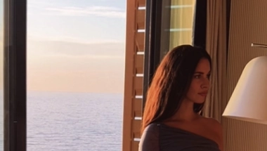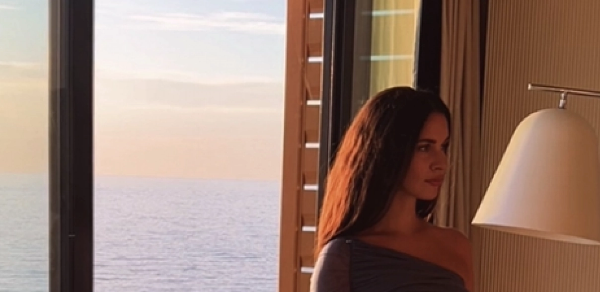 Na slici, Dragana pozira pored prozora s pogledom na more i zalazak sunca, noseći usku haljinu na jedno rame koja je savršeno istakla njenu figuru