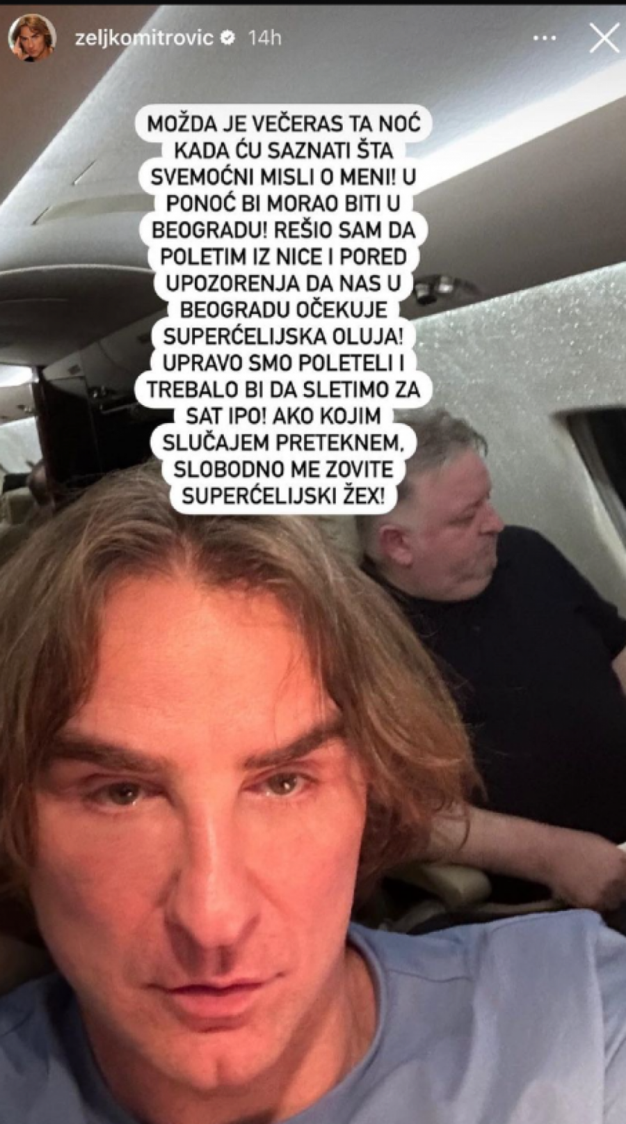 - Upravo smo poleteli i trebalo bi da sletimo za sat i po. Ako kojim slučajem preteknem, slobodno me zovite superćelijski Žex - naveo je Mitrović u objavi na svom Instagram profilu.