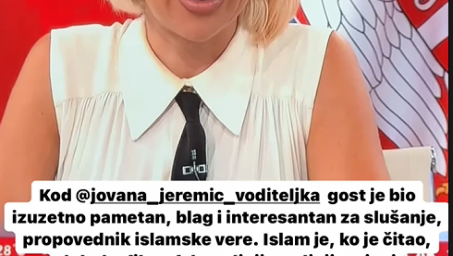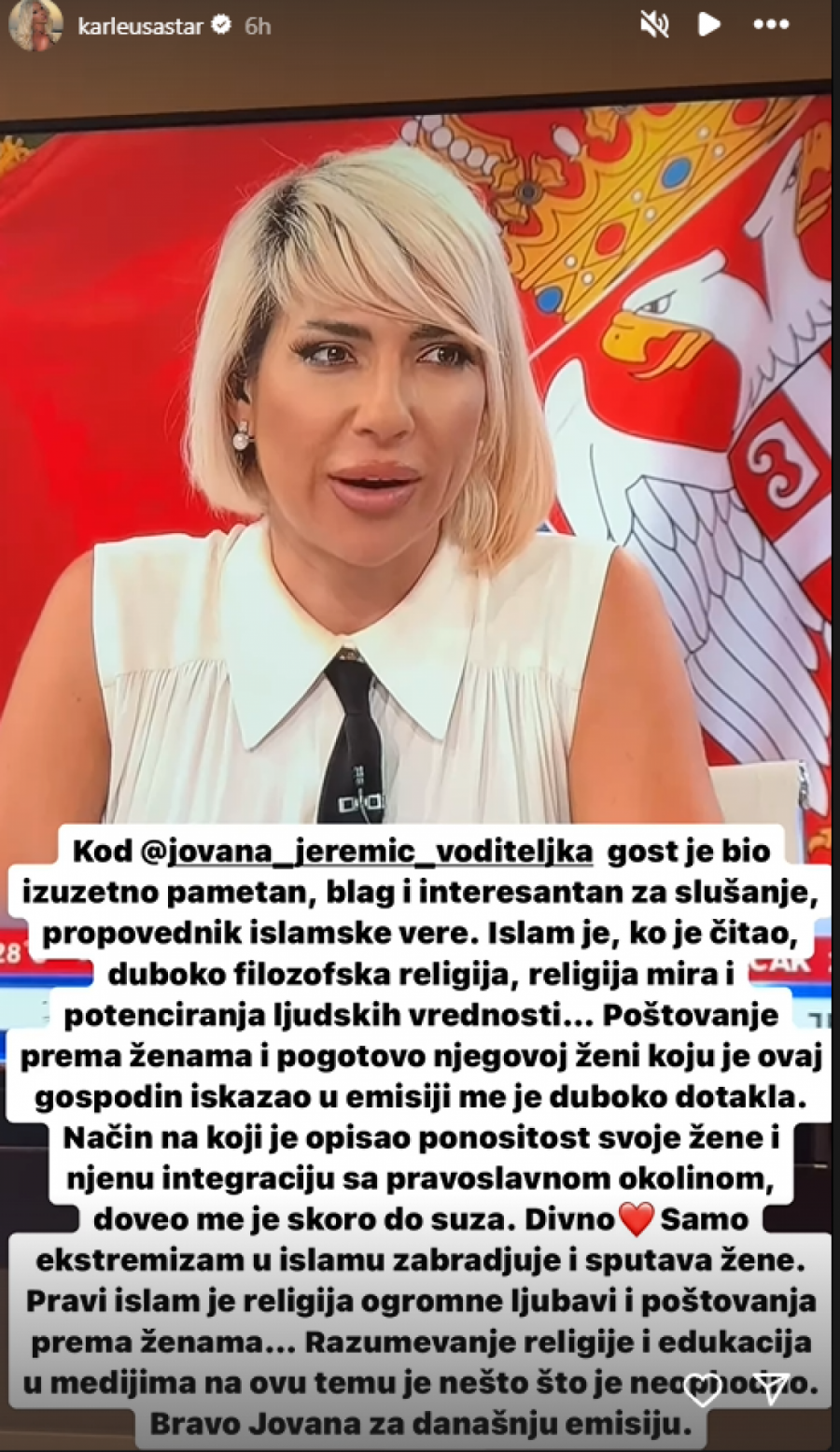 - Kod Jovane Jeremić gost je bio izuzetno pametan, blag i interesantan za sluđanje, propovednik islamske vere. Islam je, ko je čitao, duboko filozofska religija, religija mira i potenciranja ljudskih vrednosti. Postovanje prema ženama i pogotovo njegovoj ženi koju je ovaj gospodin iskazao u emisiji me je duboko dotakla. Način na koji je opisao ponositost svoje žene i njenu integraciju sa pravoslavnom okolinom, doveo me je skoro do suza. Divno. Samo ekstremizam u islamu zabrađuje i sputava žene. Pravi islam je religija ogromne ljubavi i poštovanja prema ženama.. Razumevanje religije i edukacija u medijima na ovu temu je nešto što je neophodno. Bravo, Jovana, za današnju emisiju - napisala je Karleuša.