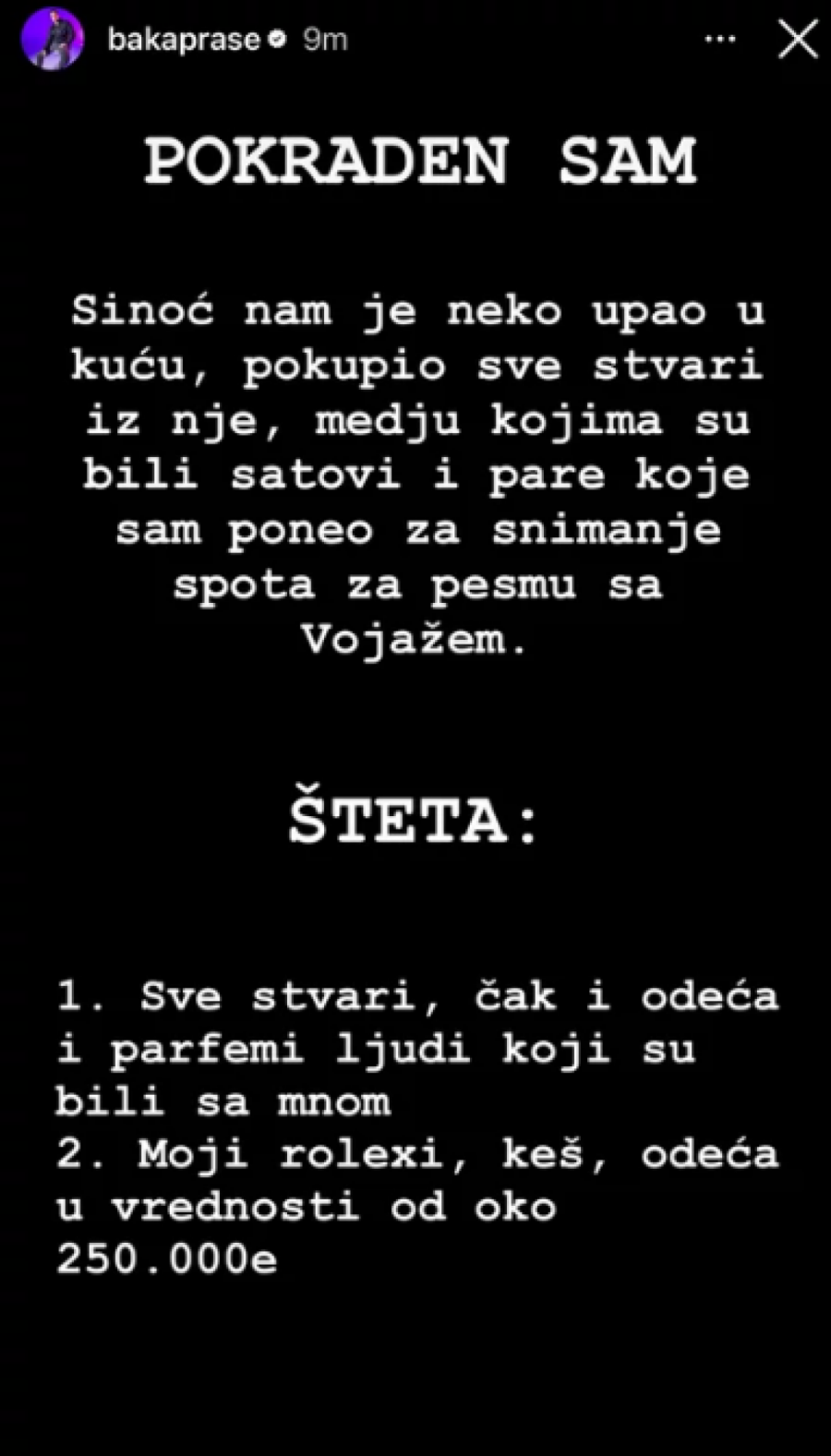 -Pokraden sam. Sinoć nam jeneko upao u kuću, pokupio sve stvari iz nje, među kojima su bili i satovi i pare koje sam poneo za snimanje spota za pesmu sa Vojažem- napisao je Baka Prase i dodao: