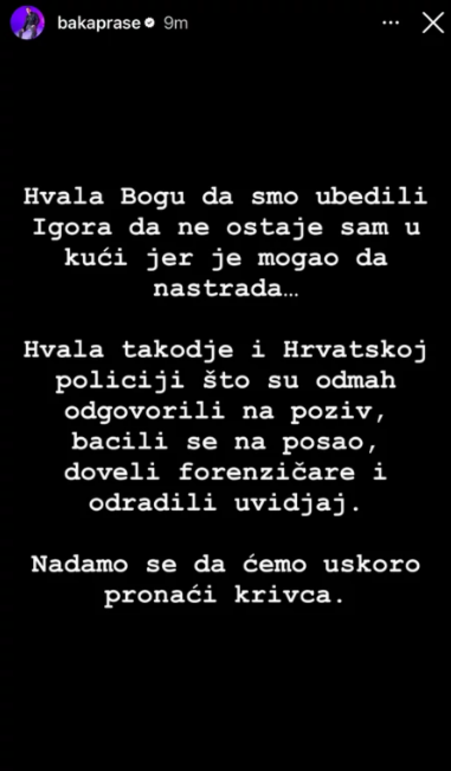 - Šteta: Sve stvari, čak i odeća i parfemi ljudi koji su bili sa mnom, moji rolakesi, keš, odeća u vrednosti od oko 250.000 evra. Hvala Bogu da smo ubedili Igora da ne ostaje sam u kući jer je mogao da nastrada. Hvala takođe i hrvatskoj policiji što su odmah odgovorili na poziv, bacili se na posao i doveli forenzičare i odradili uviđaj. Nadam se da ćemo uskoro pronaći krivca - napisao je Bogdan na društvenoj mreži Instagram.