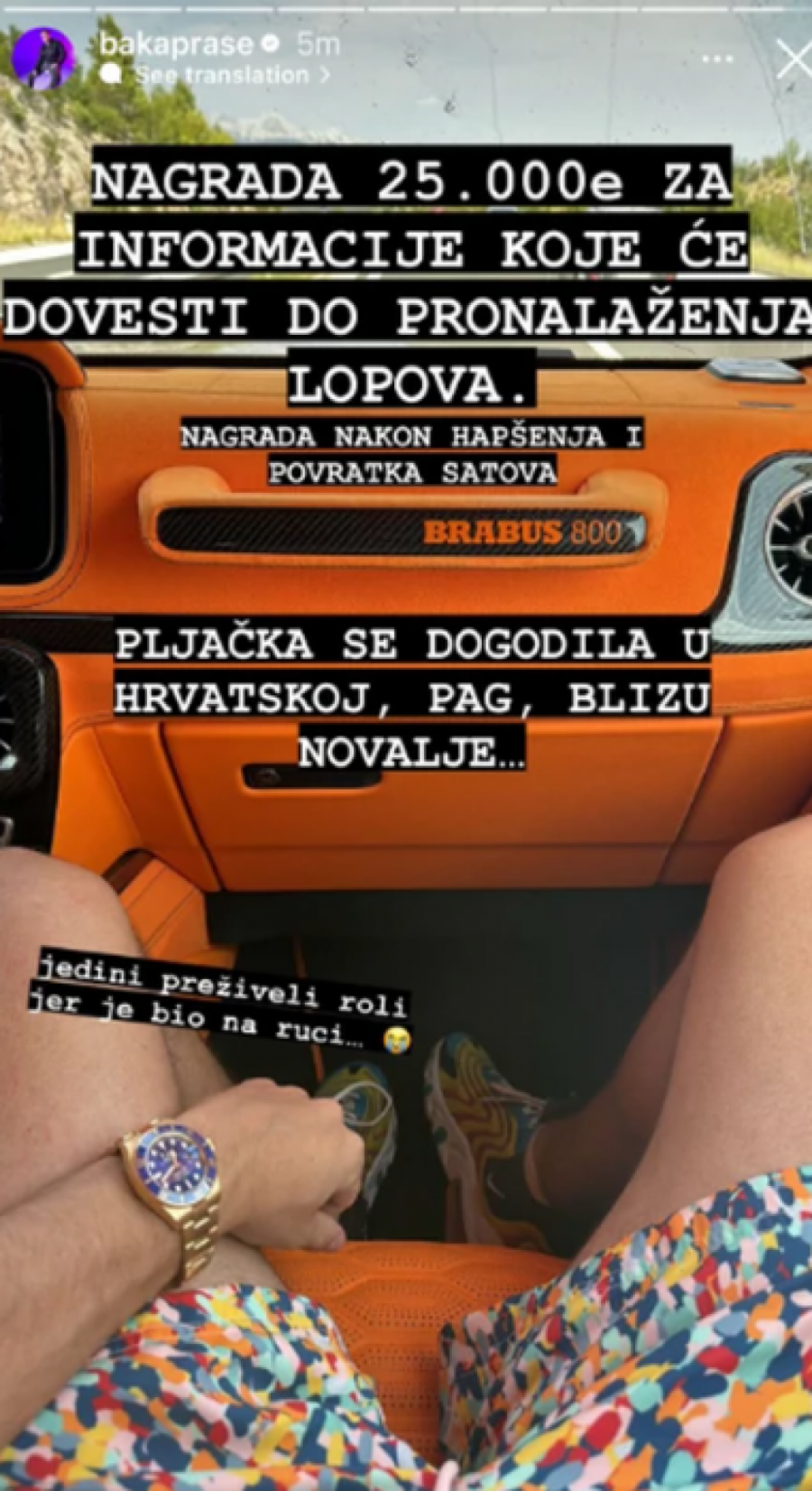 - Nagrada 25.000 evra za informacije koje će dovesti do pronalaženja lopoa. Pljačka se dogodila u Hrvatskoj, Pag, blizu Novalje. Ovo je jedini preživeli roli jer je bio na ruci - napisao je Baka Prase na Instagramu.