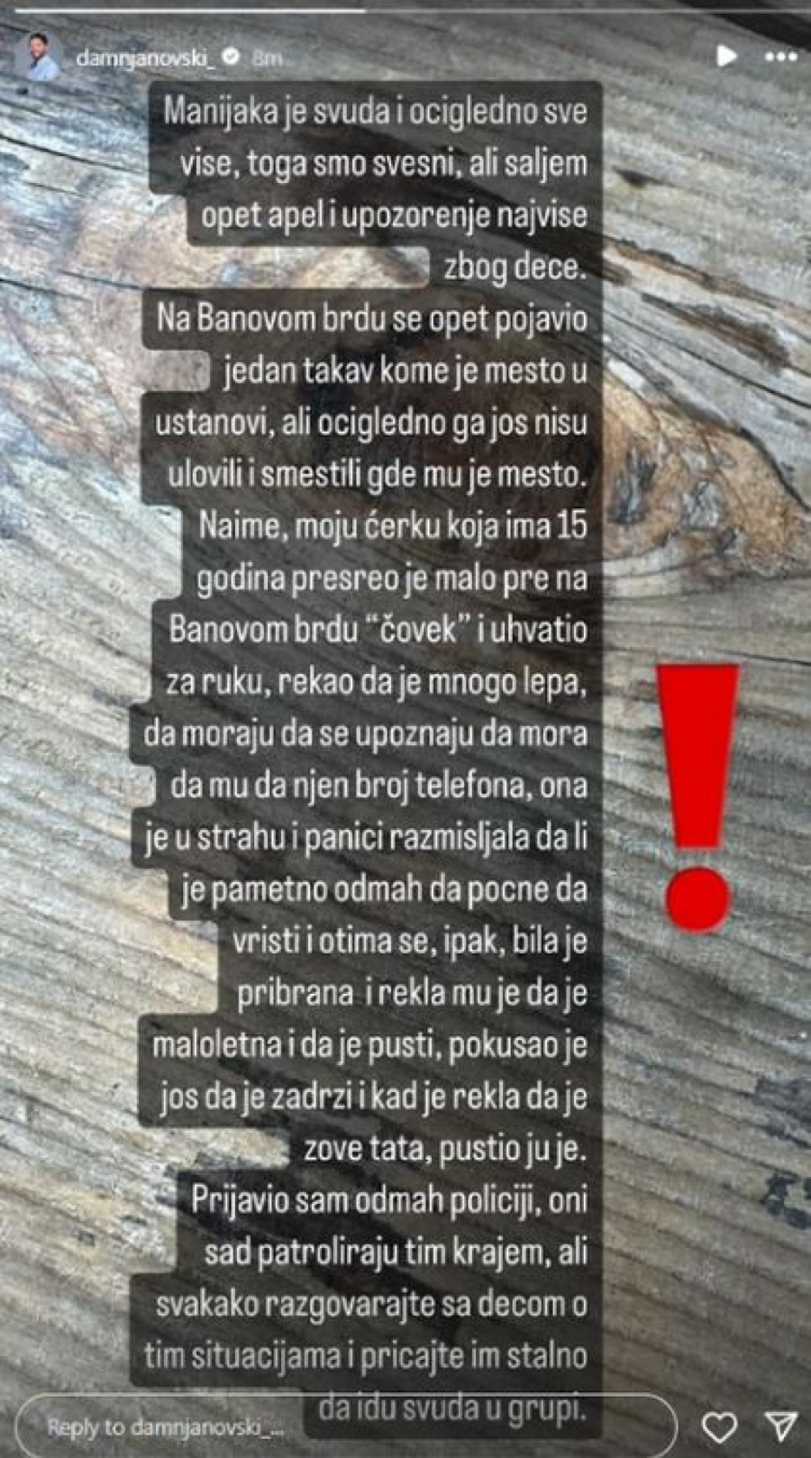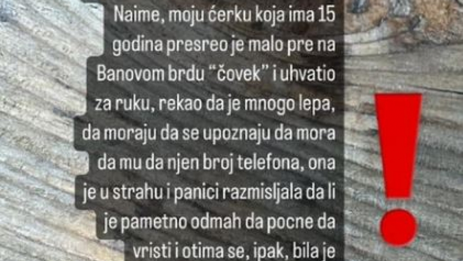 - Naime, moju ćerku koja ima 15 godina presreo je malopre na Banovom brdu "čovek" i uhvatio je za ruku. Rekao joj je da je mnogo lepa da moraju da se upoznaju, da mora da mu da njen broj telefona. Ona je u panici razmišljala da li je pametno da odmah počne da vrišti i otima se, ipak, bila je pribrana i rekla mu je da je maloletna i da je pusti. Pokušao je još da je zadrži i kada je rekla da je zove tata, pustio ju je. Prijavio sam odmah policiji, oni sad patroliraju tim krajem, ali svakako razgovarajte sa decom o tim situaciji i pričajte im da stalno svuda idu u grupi - zaključio je glumac.
