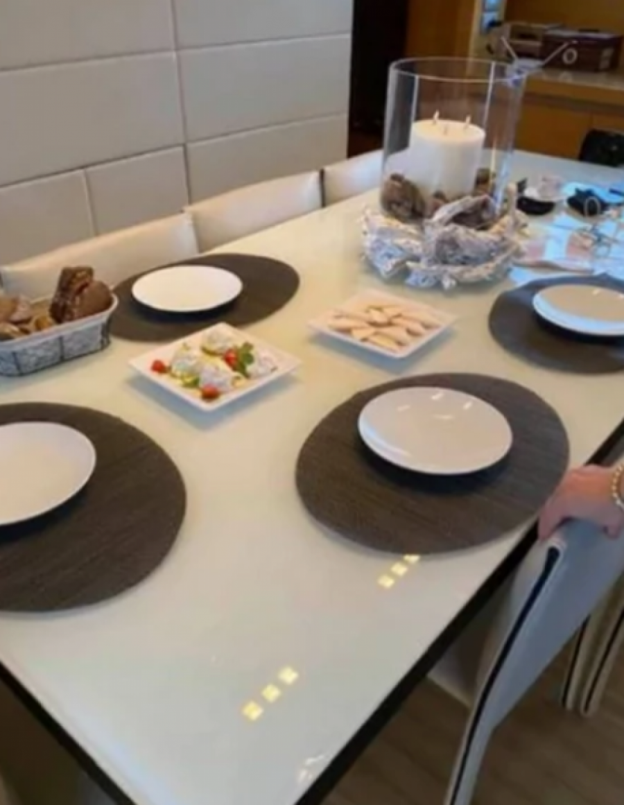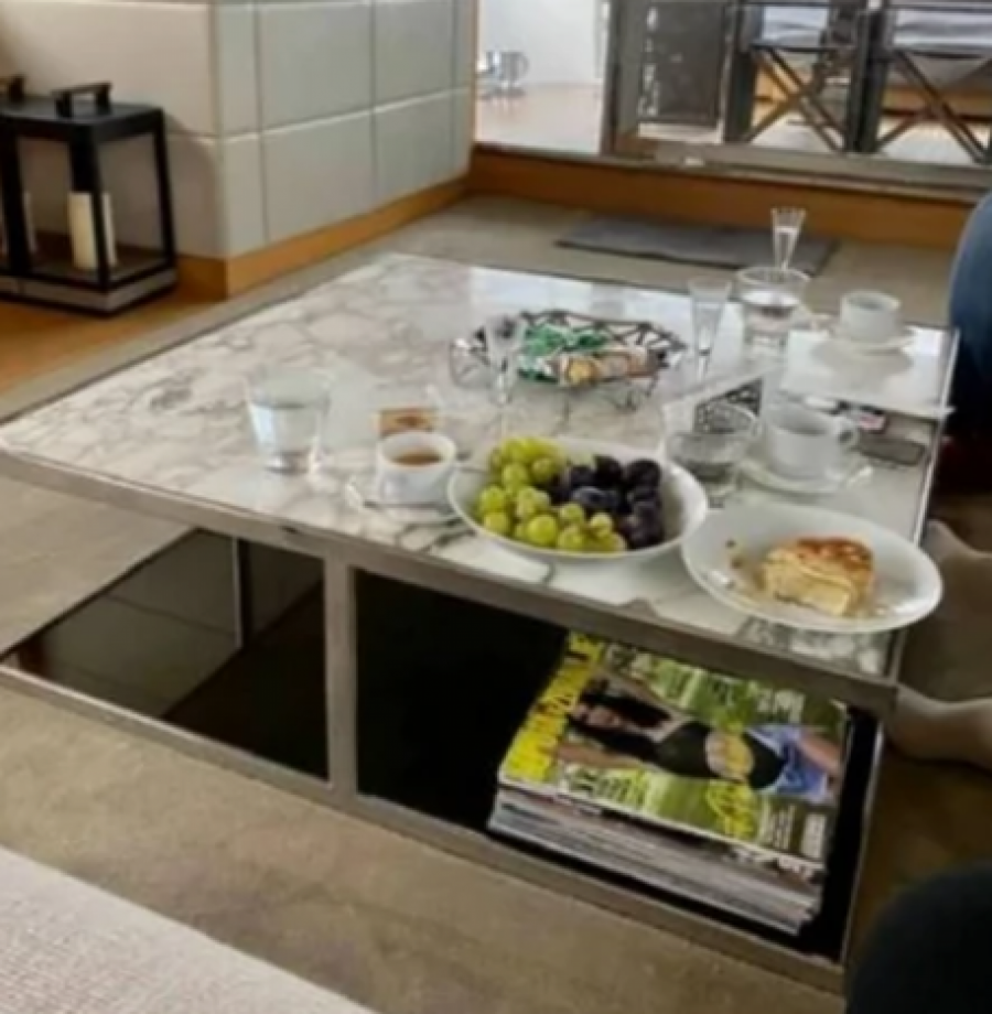 Enterijer uključuje brendirane peškire u skladu sa pločicama. Prostrana dnevna soba opremljena je mermernim stolom, velikim televizorom i zlatnim detaljima koji prostoru daju toplu atmosferu i ostavljaju bez daha.
