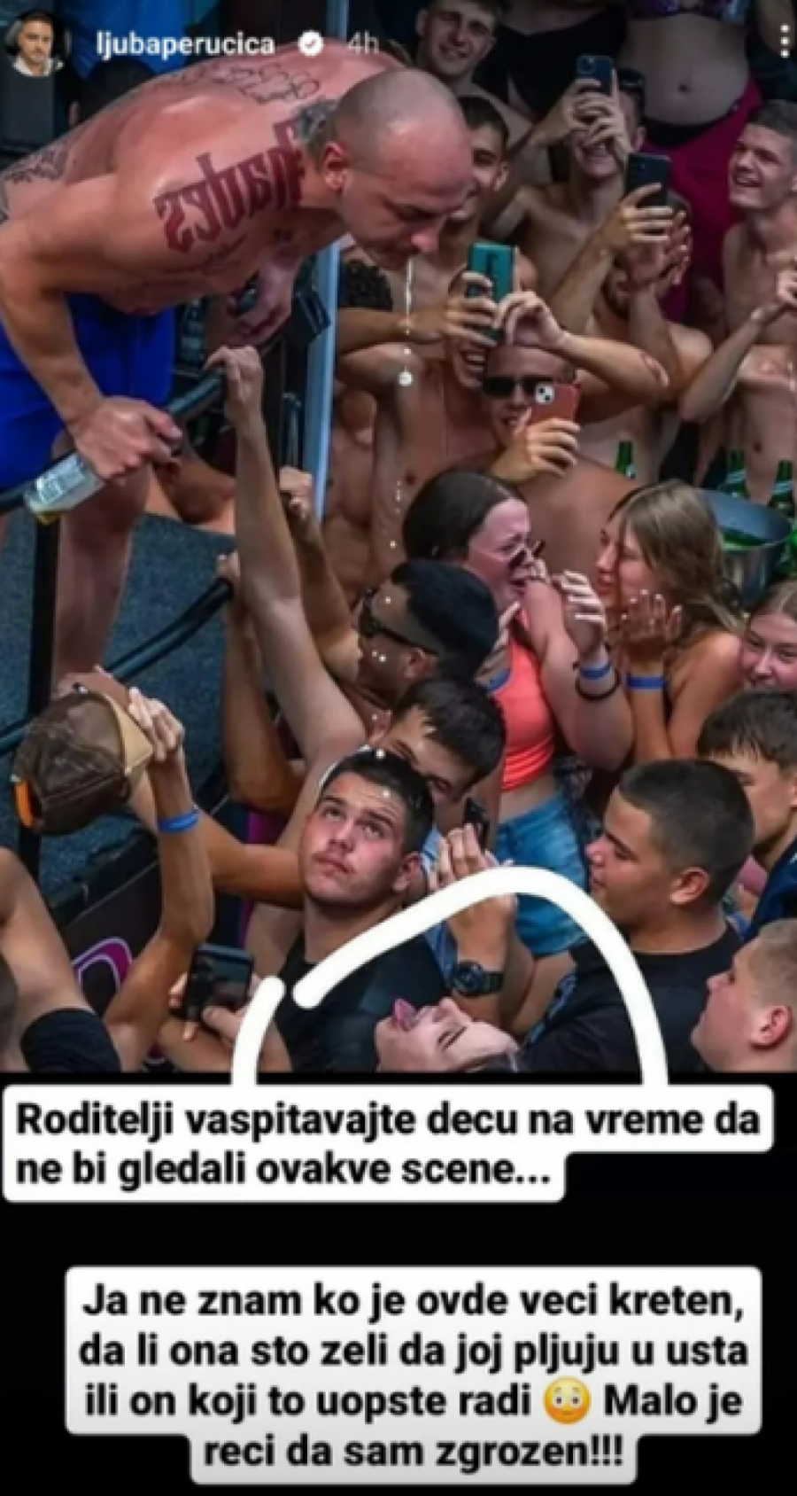 "Roditelji vaspitavajte decu na vreme da ne bi gledali ovakve scene... Ja ne znam ko je ovde veći kreten, da li ona što želi da joj pljuju u usta ili on koji uopšte to radi? Malo je reći da sam zgrožen", napisao je pevač na svom Instagramu.