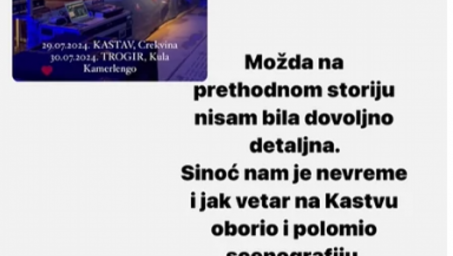 - Možda na prethodnom storiju nisam bila dovoljno detaljna. Sinoć nam je nevreme i jak vetar na Kastvu oborio i polomio scenografiju. Prinuđeni smo da pomerimo datume izvođenja predstava, jer nemamo tehničke uslove da predstavu održimo. Hvala na razumevanju i vidimo se!