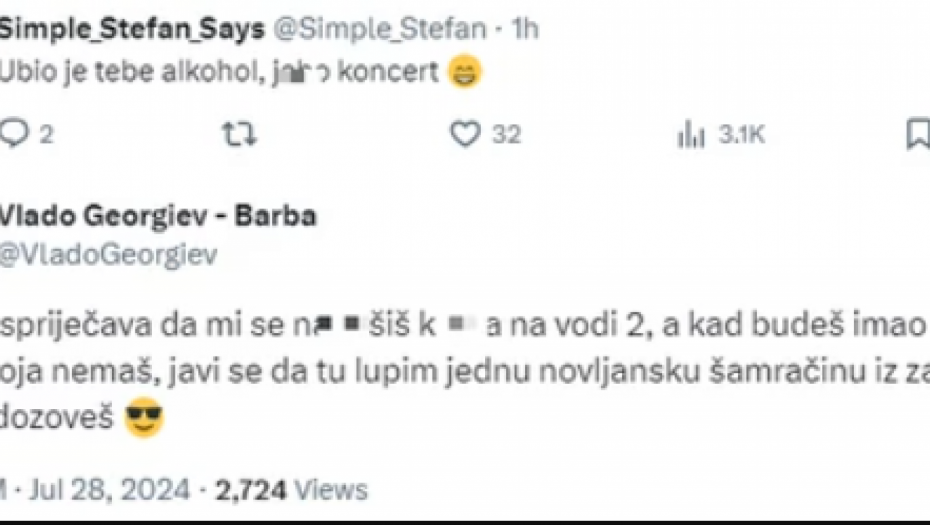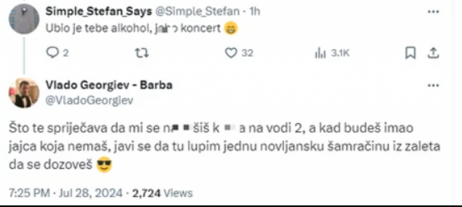 - Što te sprečava da mi se n**ušiš k****a na vodi 2, a kad budeš imao jajca koja nemaš, javi se da tu lupim jednu novljansku šamarčinu iz zaleta da se dozoveš - poručio je Vlado korisniku Tvitera.