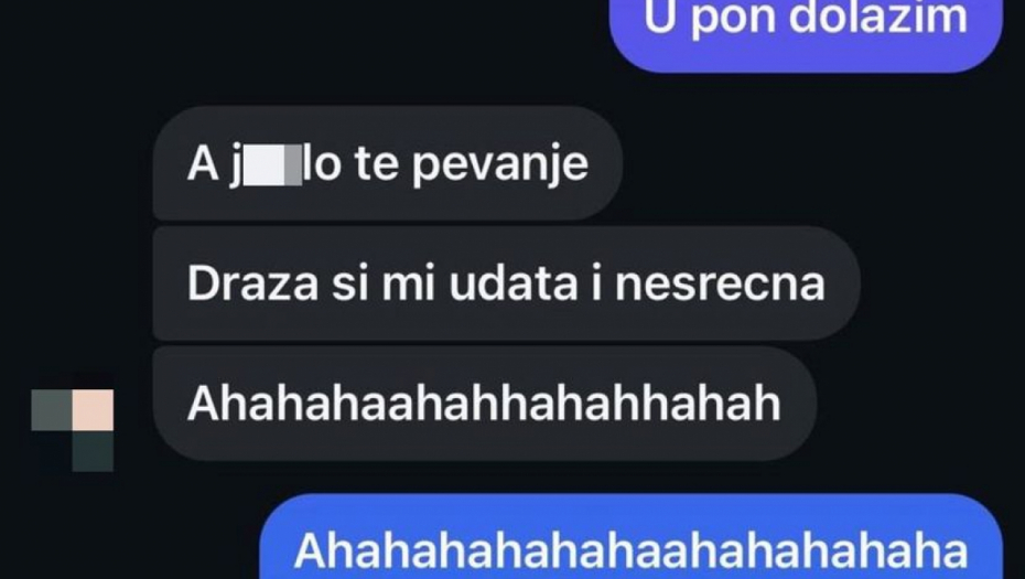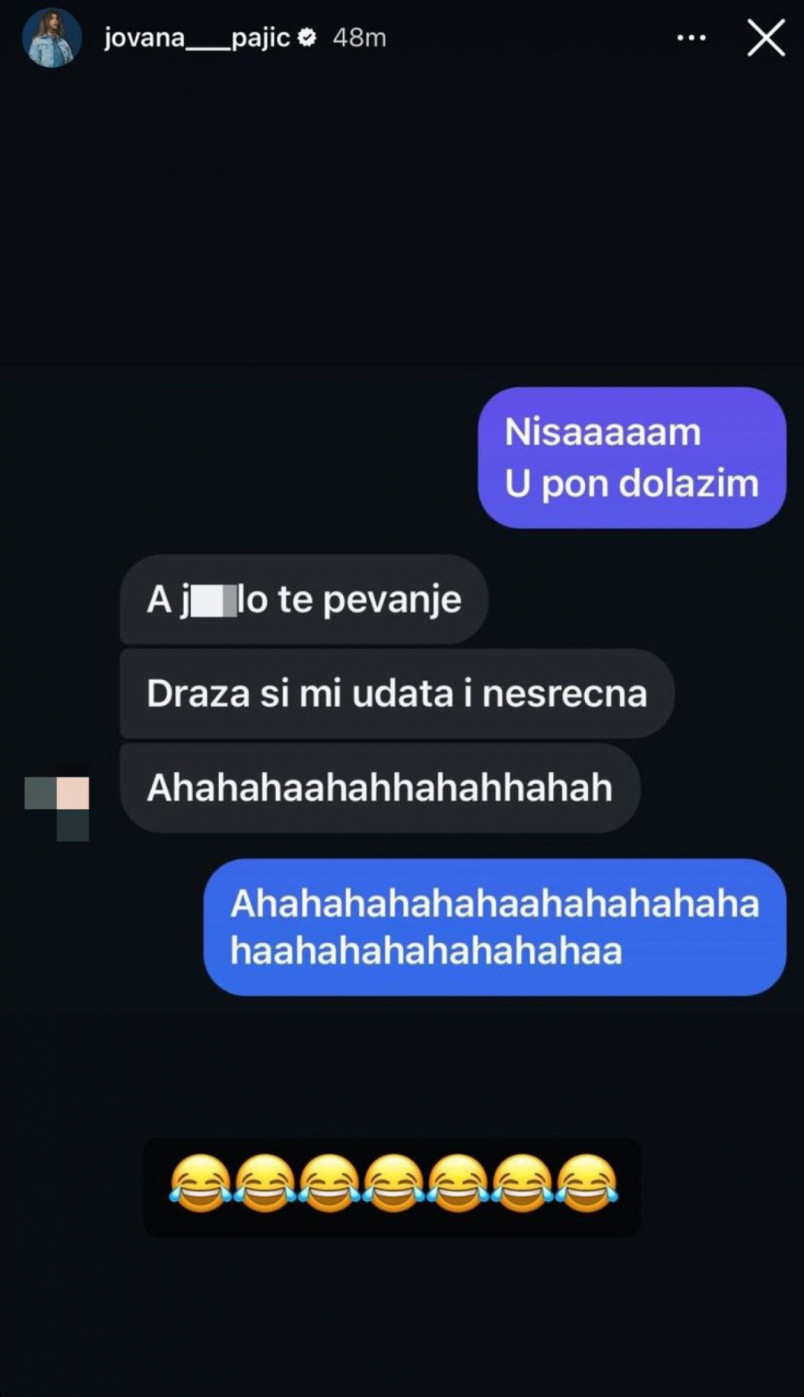 - A j***lo te pevanje. Draža si mi udata i nesrećna hahaha - dobila je odgovor Jovana Pajić, što ju je do suza nasmejalo.