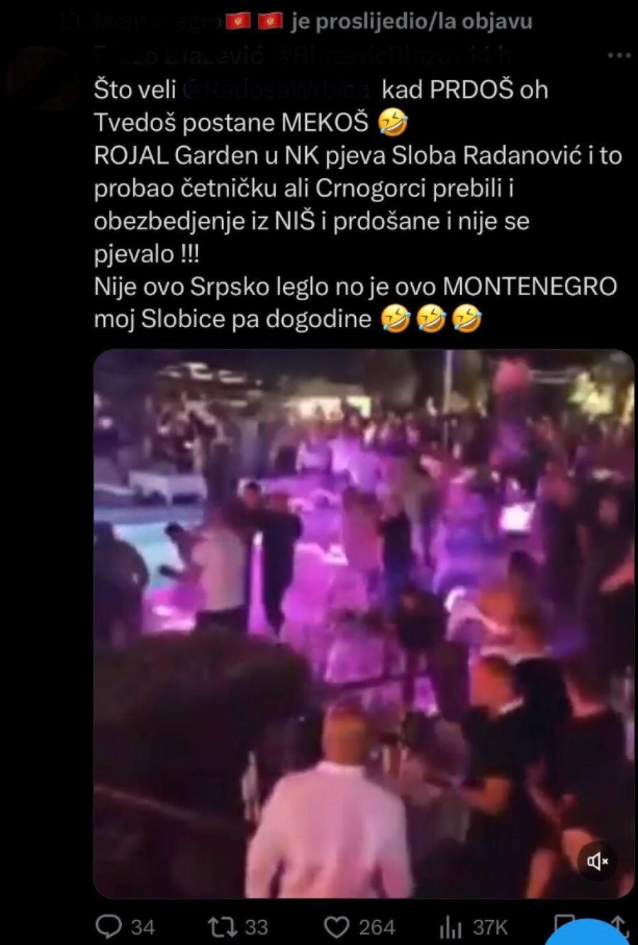 "U Nikšiću peva Sloba Radanović i to probao četničku, ali Crnogorci prebili i obezbeđenje iz Niša i prdošane i nije se pevalo!", "Nije ovo srpsko leglo, no je ovo Montenegro, moj Slobice, pa dogodine!", "Neka dovedu normalne pevače, a ne ove provokatore, pa neće biti problem!", "Neka se prdošani pojačaju za sledeću svirku i neka povedu popa za sreću! Dripac nevaspitani! Bravo za normalni Nikšić!", "Nikšićani obično lepo dočekaju svakoga, ali ako si došao da mašeš sa tri prsta, da kličeš Kosovu i da provociraš, onda prti! Lemimo četnike gde stignemo!" - samo su neki od komentara na Iksu.