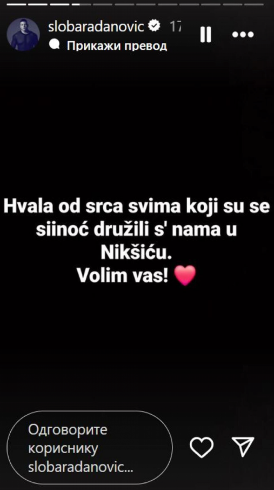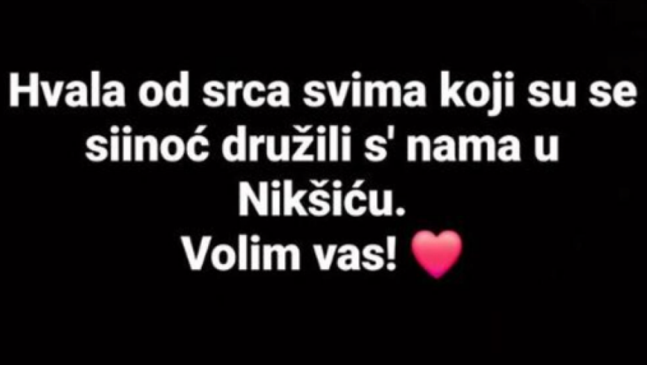 - Hvala od srca svima koji su se sinoć s nama družili u Nikšiću! Volim vas - bio je jasan pevač.