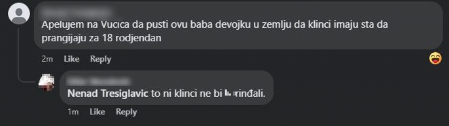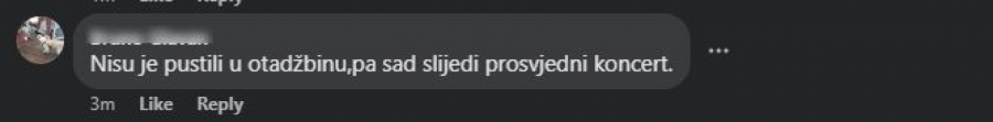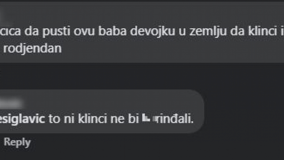- "Javila se moralna vertikala da podučava narod", "Nisu je pustili u otadžbinu, pa sad sledi protestni koncert", "Apelujem na Vučica da pusti ovu baba-devojku u zemlju da klinci imaju šta da prangijaju za 18. rođendan", "To ni klinci ne bi **rinđali" - bili su samo neki od komentara na mrežama.