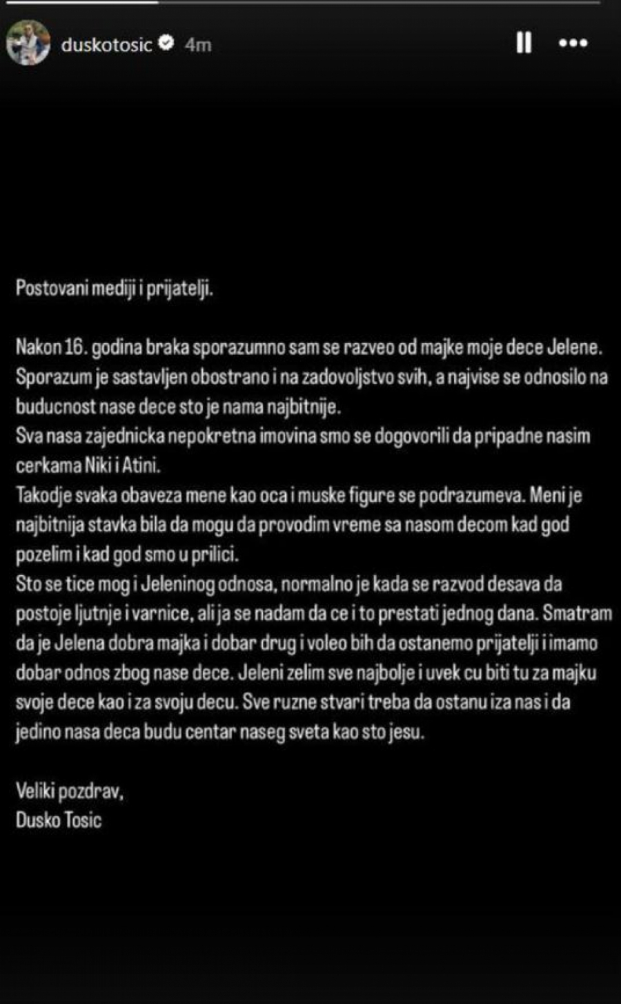 - Što se tiče Jeleninog i og odnosa, normalno je kada se razvod dešava, da postoje ljutnje i varnice, ali ja se nadam da će i to prestati jednog dana. Smatram da je Jelena dobra majka i dobar drug i voleo bih da ostanemo prijatelji i da imamo dobar odnos zbog naše dece. Jeleni želim sve najbolje i uvek ću biti tu za majku svoje dece, kao i za svoju decu. Sve ružne stvari treba da ostanu izta nas i jedino naša deca treba da budu centar našeg sveta, kao što i jesu - zaključio je Tošić.