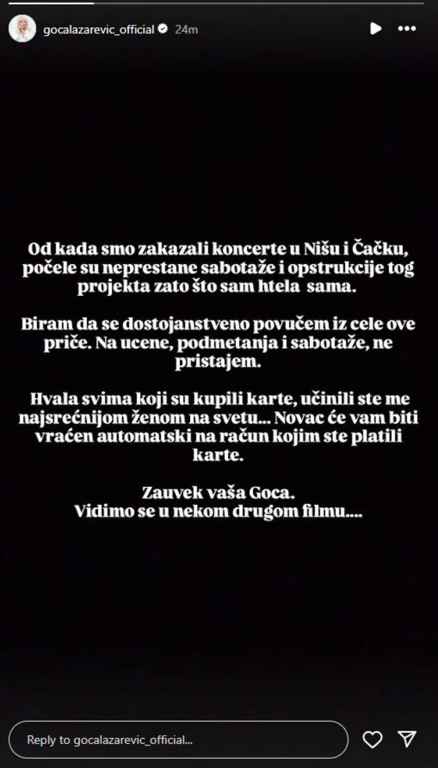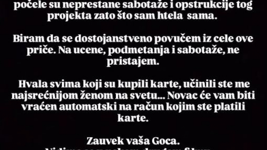- Od kada smo zakazali koncerte u Nišu i Čačku počele su neprestane sabotaže i opstrukcije tog projekta zato što sam htela sama. Biram da se dostojanstveno povučem iz cele ove priče. Na ucene, podmetanja i sabotaže ne pristajem - napisala je Goca na svom Instagram profilu, pa dodala: