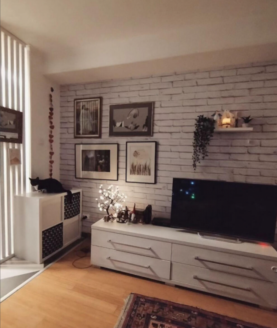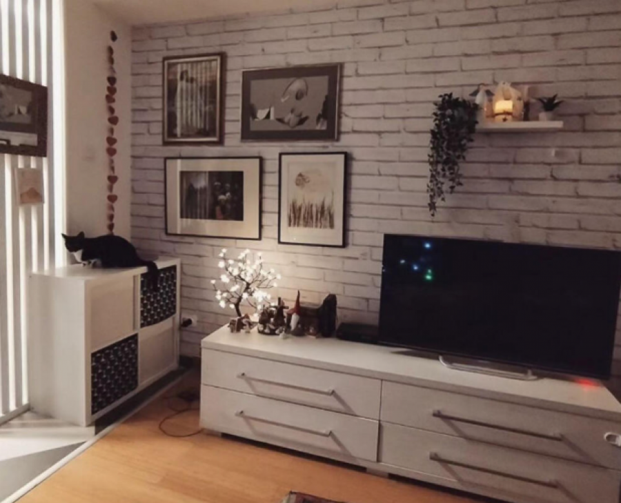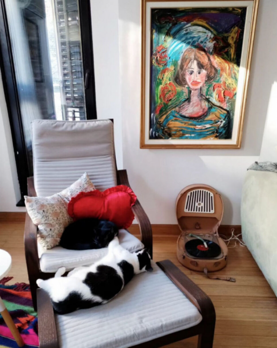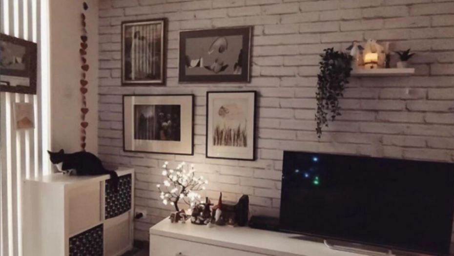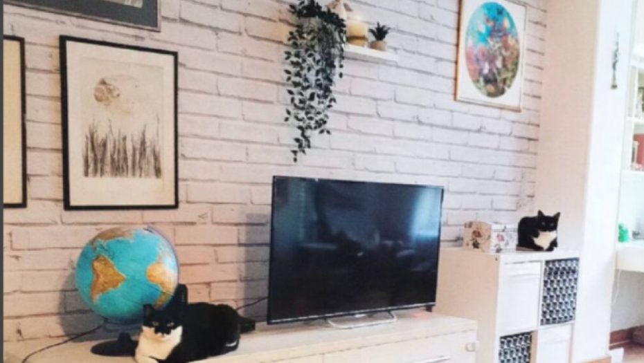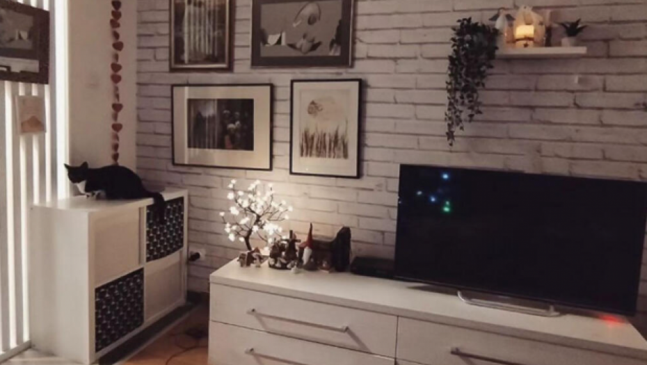 Dnevna soba je prostrana, sa slikama na gotovo svakom zidu, a nameštaj u vedrim bojama, među kojima pretenduje bela. Polica za televizor načičkana je raznim ukasima, a ono što su svi primetili jeste i da je baš ona mesto koje njene mačke obožavaju i na kojem često odmaraju.