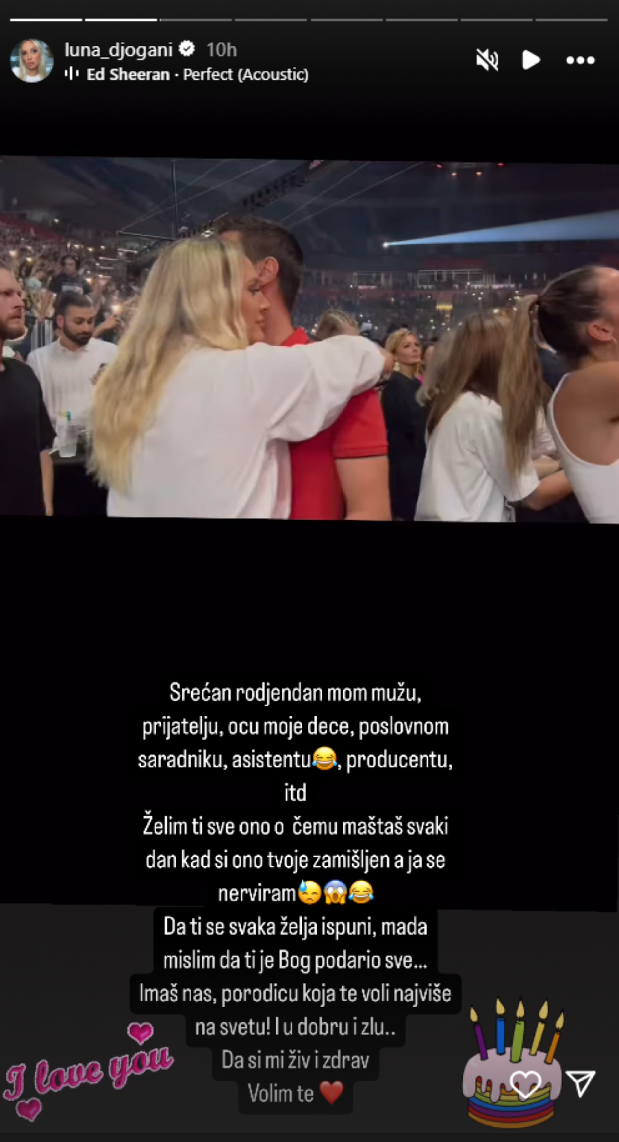 - Srećan rođendan, mužu moj, prijatelju, ocu moje dece, poslovnom saradniku, asistentu, producentu... Želim ti sve ono čemu maštaš svaki dan kad si ono tvoje zamišljen, a ja se nerviram. Da ti se svaka želja ispuni, mada mislim da ti je Bog podario sve... Imaš nas, porodicu koja te voli najviše na svetu. I u dobru i u zlu. Da si živ i zdrav.Volim te - napisala je Luna.