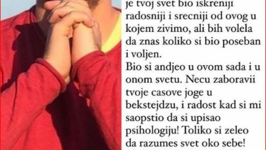 - Hoću samo da znaš da si bio poštovan i voljen, možda toga nisi bio svestan, možda je tvoj svet bio iskreniji, radosniji i srećniji od ovog u kojem živimo, ali bih volela da znaš koliko si bio poseban i voljen. Bio si anđeo u ovom sada i u onom svetu. Neću zaboraviti tvoje časove joge u bekstejdžu, i radost kad si mi saopštio da si upisao psihologiju! Toliko si želeo da razumeš svet oko sebe! - napisala je, pa dodala: