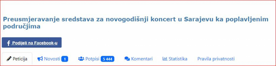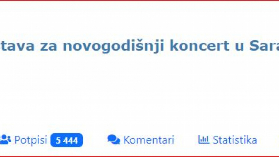 „Dragi sugrađani, u svetlu nacionalne tragedije i poplava koje su pogodile delove naše zemlje, smatramo da je prioritet pomoći našim sugrađanima koji su izgubili imovinu, domove, živote. Organizacija novogodišnjeg koncerta u Sarajevu je značajan kulturni događaj, ali s obzirom na trenutnu situaciju, pozivamo vlasti da preusmere sredstva predviđena za ovaj koncert ka hitnoj pomoći i sanaciji štete u poplavljenim područjima.