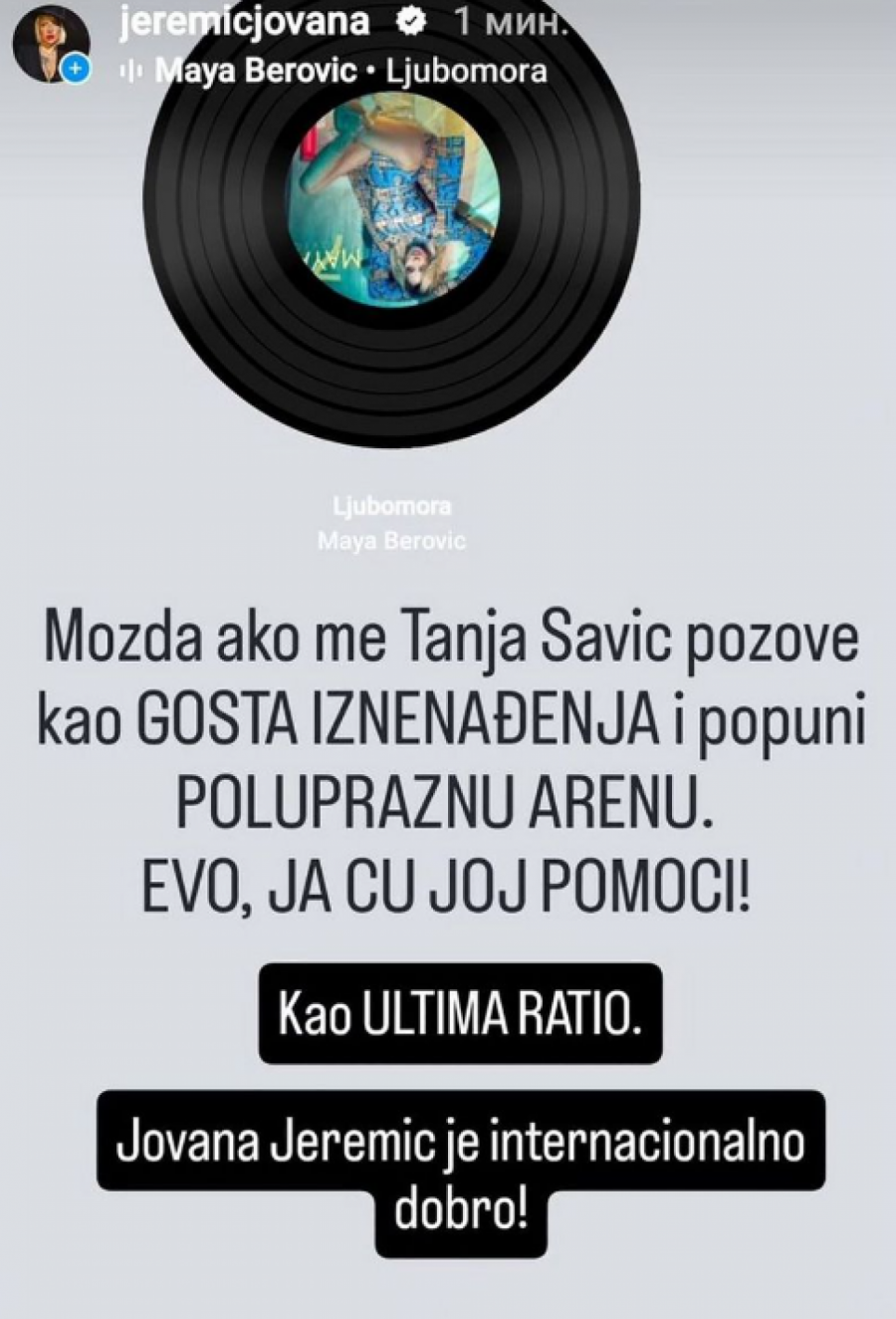 Jovana je dodala da je "internacionalno dobro", dok je u pozadini ovaj tekst pratila pesma "Ljubomora" od Maje Berović.