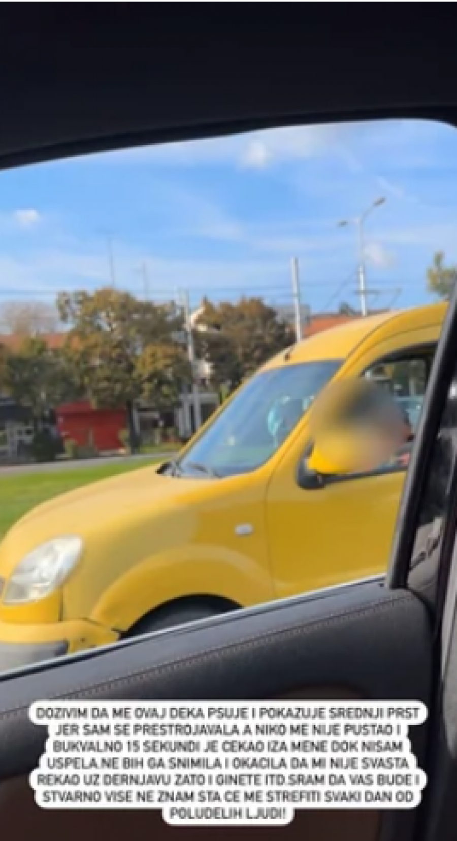 - Doživim da me ovaj deka psuje i pokazuje srednji prist jer sam se prestrojavala, a niko me nije pustio i bukvalno 15 sekundi iza mene je čekao dok nisam uspela. Ne bih ga okačila i snimila da mi nije svašta rekao uz dernjavu, zato i ginete itd... Sram da vas bude, stvarno više ne znam šta će me strefiti svaki dan od poludelih ljudi - napisala je pevačica u opisu videa.