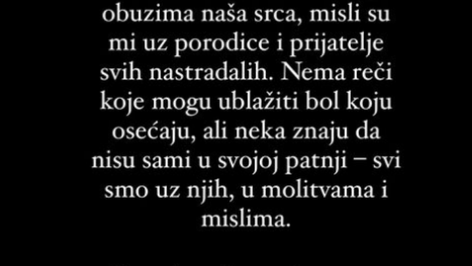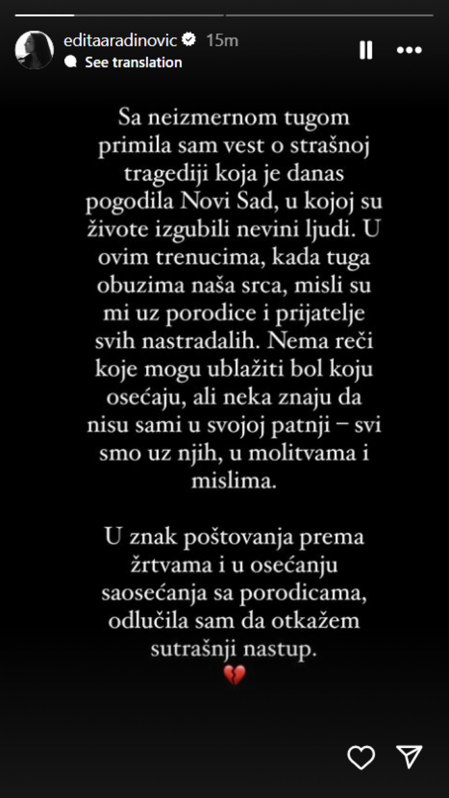- Sa neizmernom tugom primila sam vest o strašnoj tragediji koja je danas pogodila Novi Sad, u kojoj su živote izgubili nevini ljudi. U ovim trenucima, kada tuga obuzima naša srca, misli su mi uz porodice i prijatelje svih nastradalih. Nema reči koje mogu ublažiti bol koju osećaju, ali neka znaju da nisu sami u svojoj patnji - svi smo uz njih, u molitvama i mislima. U znak poštovanja prema žrtvama i u saosećanju sa porodicama, odlučila sam da otkažem sutrašnji nastup - napisala je Edita vidno potresena.