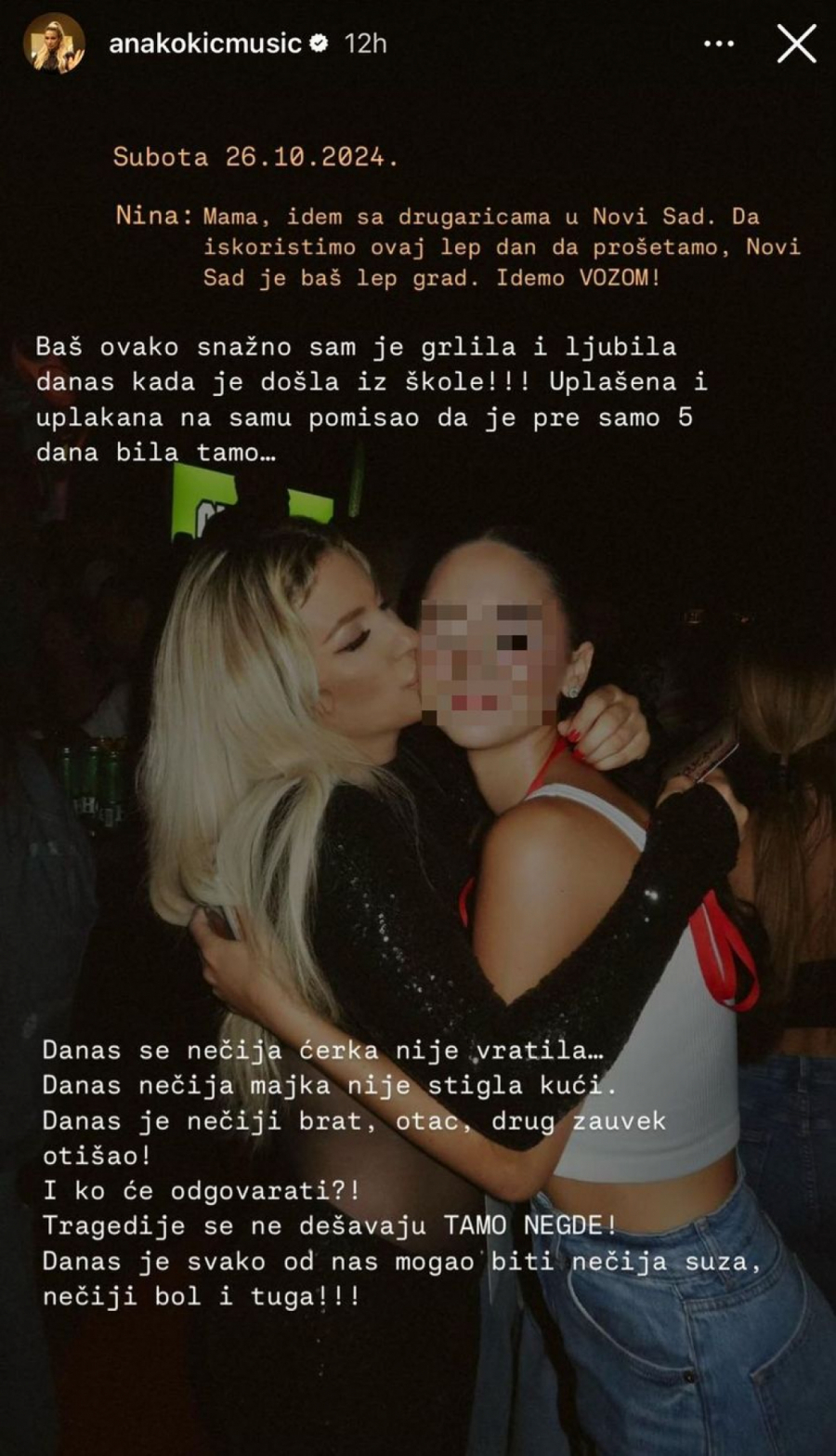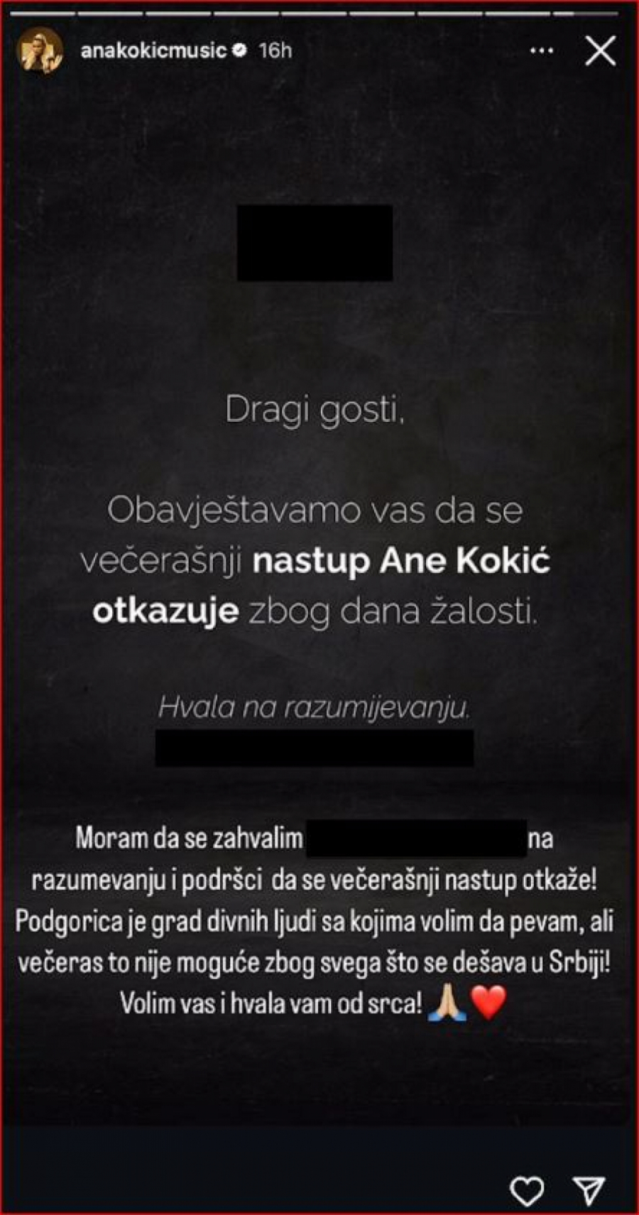 - Moram da zahvalim na razumevanju i podršci da se večerašnji nastup otkaže. Podgorica je grad divnih ljudi sa kojima volim da pevam, ali večeras to nije moguće zbog svega što se dešava u Srbiji! Volim vas i hvala vam od srca - napisala je Ana Kokić na svom Instagram profilu.