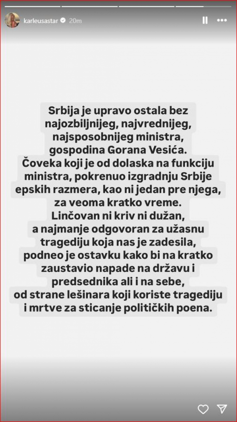 - Linčovan ni kriv ni dužan, a najmanje odgovoran za užasnu tragediju koja nas je zadesila, podneo je ostavku kako bi na kratko zaustavio napade na državu i predsednika, ali i na sebe, od strane lešinara koji koriste tragediju i mrtve za sticanje politickih poena - zaključila je Karleuša na svom Instagram profilu.