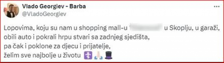 - Lopovima koji su nam u šoping molu u Skoplju, u garaži, obili auto i pokrali hrpu stvari sa zadnjeg sedišta, pa čak i poklone za decu i prijatelje, želim sve najbolje u životu - napisao je Georgiev na društvenoj mreži X.