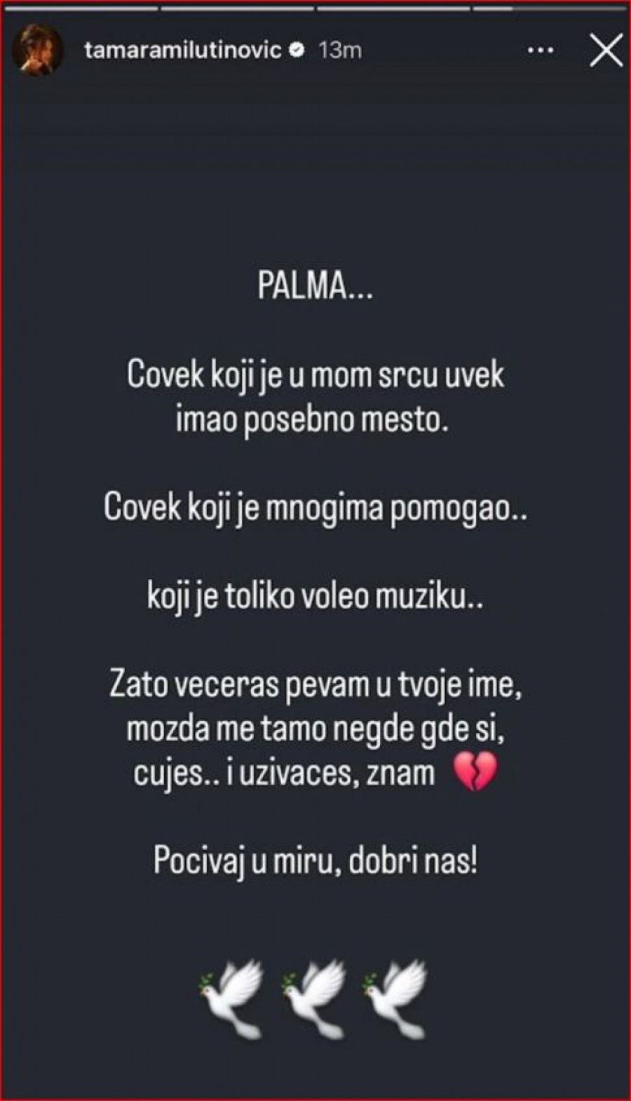 Pevačica Tamara Milutinović godinama je poznavala Palmu i imala je priliku da mu peva, a koliko poštovanja je imala prema njemu, pokazala je i u oproštajnoj poruci koju je objavila na Instagramu.