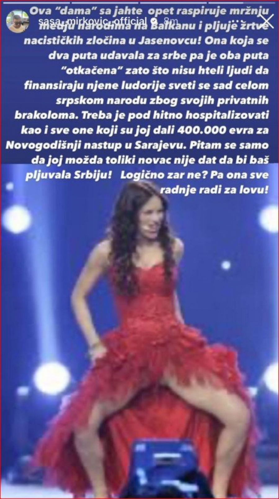 - Ova "dama" sa jahte opet raspiruje mržnju među narodima na Balkanu i pjuje žrtve nacističkih zločina u Jasenovcu. Ona, koja se dva puta udavala za Srbe, pa je oba puta "otkačena" zato što nisu hteli ljudi da finansiraju njene ludorije, sveti se sada celom srpskom narodu zbog svojih privatnih brakoloma. Treba je pod hitno hospitalizovati kao i sve one koji su joj dali 400.000 evra za novogodišnji nastup u Sarajevu. Pitam se samo, da joj možda toliki novac nije dat da bi baš pljuvala Srbiju! Logično, zar ne? Pa ona sve radnje radi za lovu - poručio je Saša Mirković putem svog Instagram naloga.