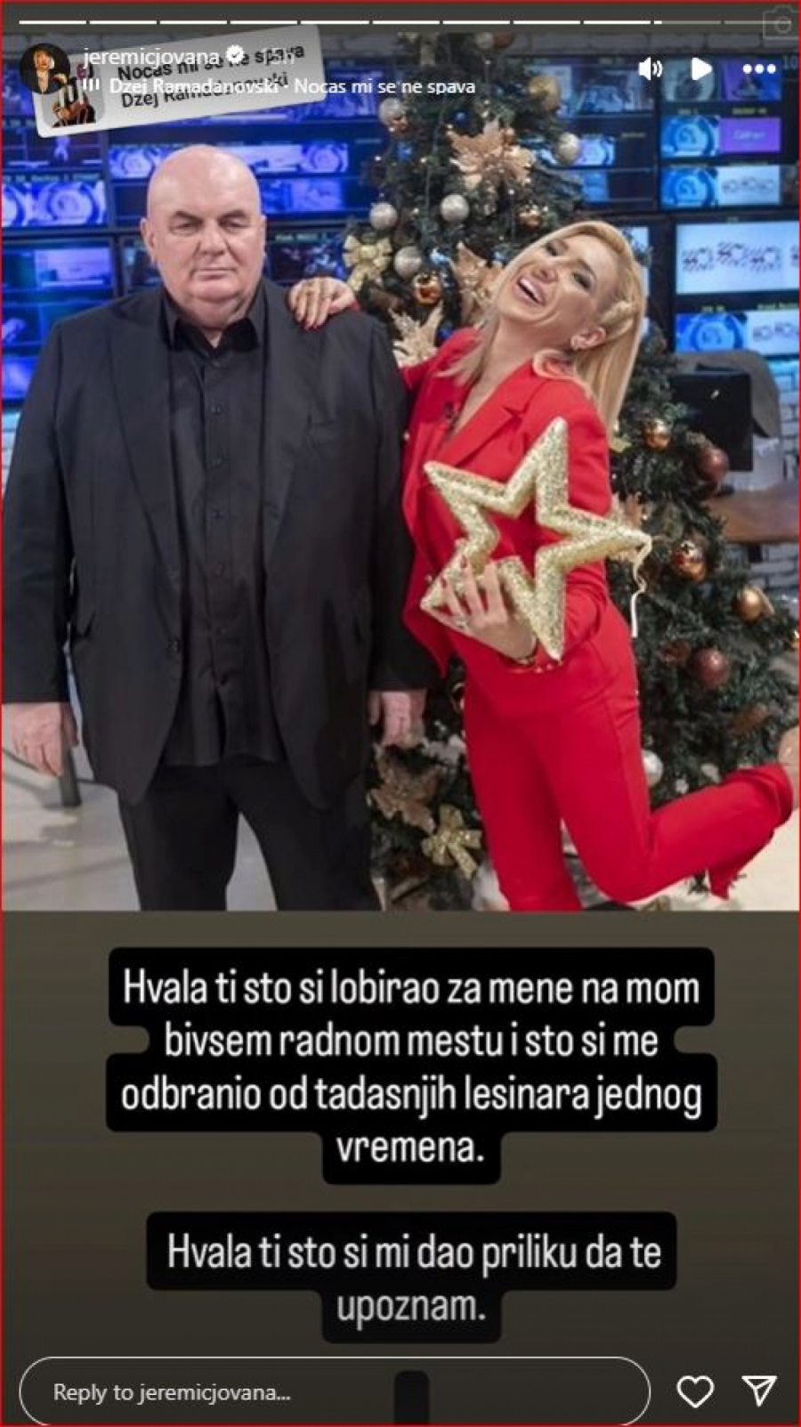 - Ti i ja nikad nismo mogli normalno, samo posebno da radimo! Druže moj, hvala ti što si sve ove godine pratio moju energiju, podržavao me i podsećao ko sam ja, Jovana Jeremić (posebno kad se zaljubim, ja odlepim). Hvala ti što si lobirao za mene na mom bivšem radnom mestu i što si me odbranio od tadašnjih lešinara jednog vremena. Hvala ti što si mi dao priliku da te upoznam - napisala je, pa dodala: