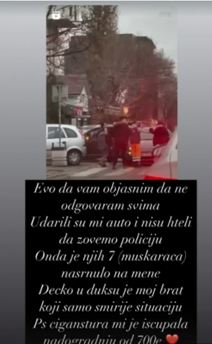 - Evo da vam objasnim da ne odgovaram svima. Udarili su mi auto i nisu hteli da zovemo policiju. Onda je sedam muškaraca nasrnulo na mene. Dečko u duksu je moj brat koji samo smiruje situaciju. Iščupana mi je nadogradnja od 700 evra - napisala je ona.